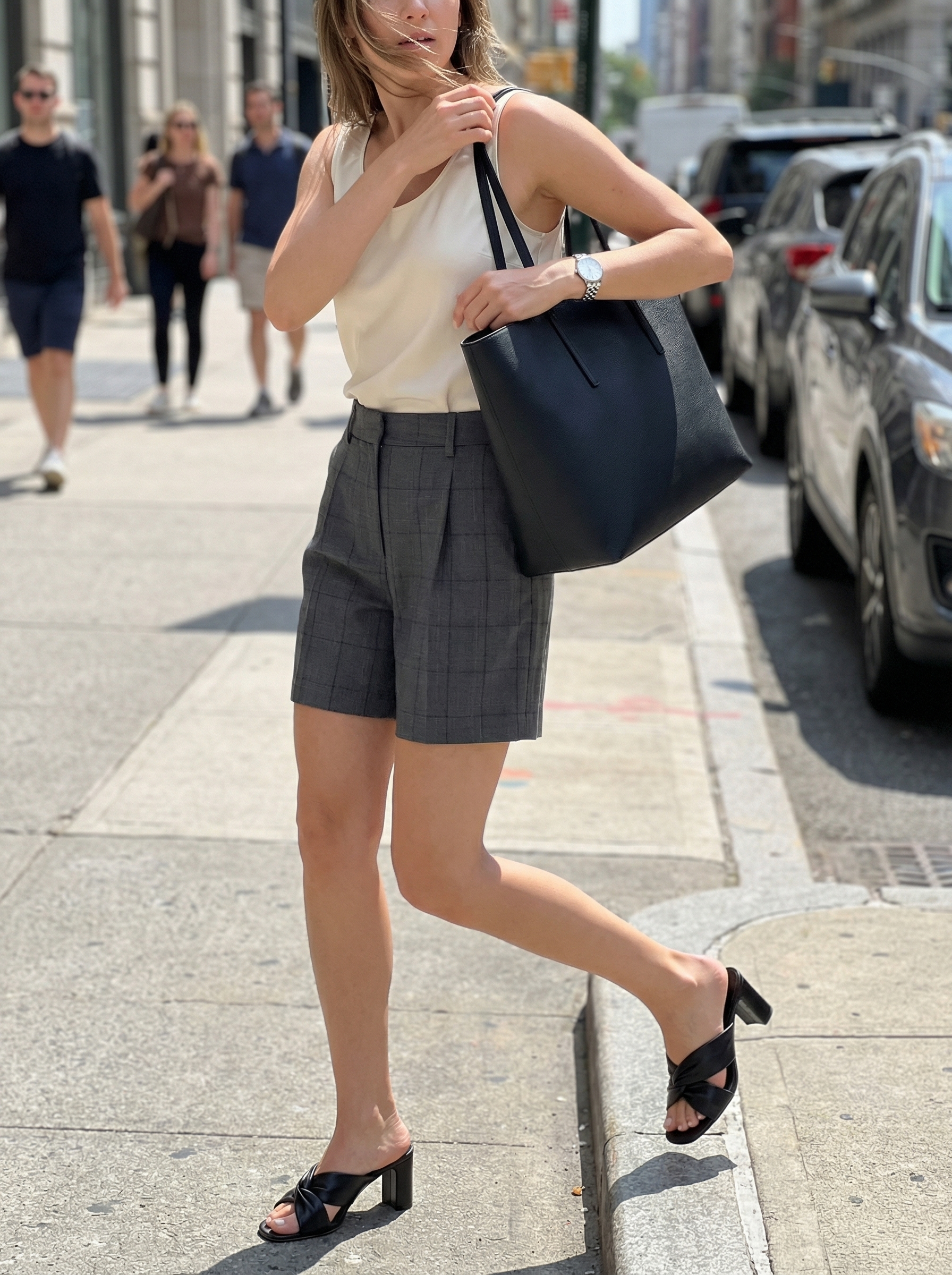 This outfit pairs grey plaid tailored shorts with a sleeveless silk-blend top, creating one of the most versatile, classy summer outfits for a professional setting. The shorts ($24.99) are a polyester blend, a material choice that helps them hold their crisp, pleated shape. The white silk-blend top ($139) is tucked in for a polished silhouette that feels both soft and structured. Completing the look are black genuine leather mules ($82) with a twist-front detail and a comfortable mid-heel, offering a chic lift that’s still practical for walking between meetings.