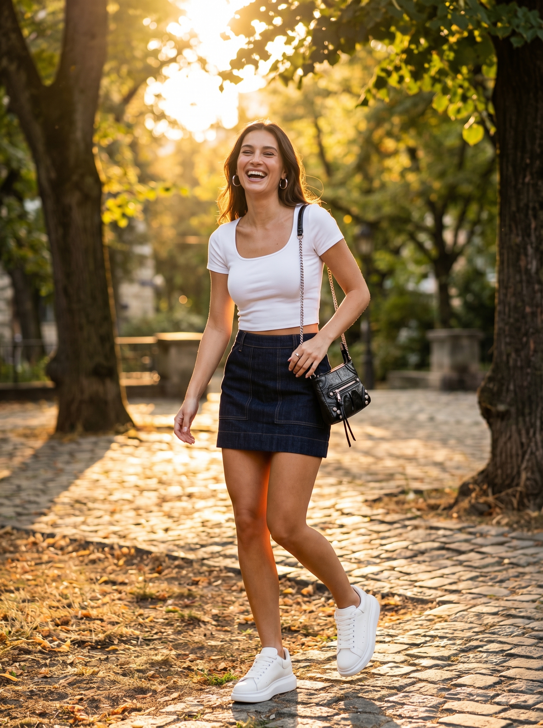 This summer concert look, totaling $193.48, centers around a dark wash denim mini skirt, providing a classic yet playful foundation for any music event. Paired with it is a fitted white ribbed crop top, perfect for staying cool and showing off a sliver of midriff—because who needs full coverage at a summer show, right? Chunky white platform sneakers keep things comfortable for dancing, while a black crossbody bag with silver hardware means your essentials are safe, and your hands are free for cheering. Silver hoops add that last touch of urban edge.