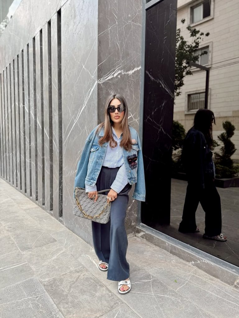 This appearance is a very lovely combination of both street and elegant. This blue chambray shirt with some loose navy pants and a loose jacket is casual but not too casual a look, and I think it could pass as a denim on denim look 2025 – good enough to errands or to wear out somewhere, and even to travel in. The impossibly large sunglasses and flawed handbag are merely just the icing on the cake.
