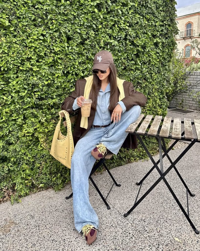 This look feels like iced lattes and Sunday markets. It mixes vintage denim favorites with a playful jacket in a women casual look, loud sneakers and accessories. It offsets the brown cap and oversized yellow tote to the ground but includes the layering effect that creates a surprising chicness that is purely 2025.