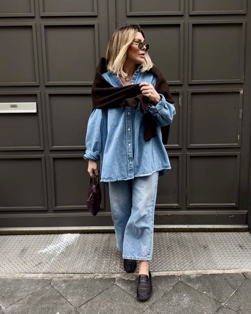 Big pale denim shirts and matching denim jeans cannot be described as anything but off-duty elegance. Throw on a knit sweater on your shoulders, and add dark loafers and you are chic in a second. The comfortable luxury made in the 2025 style there is no pretense about this one: it is cozy, friendly, and highly wearable.