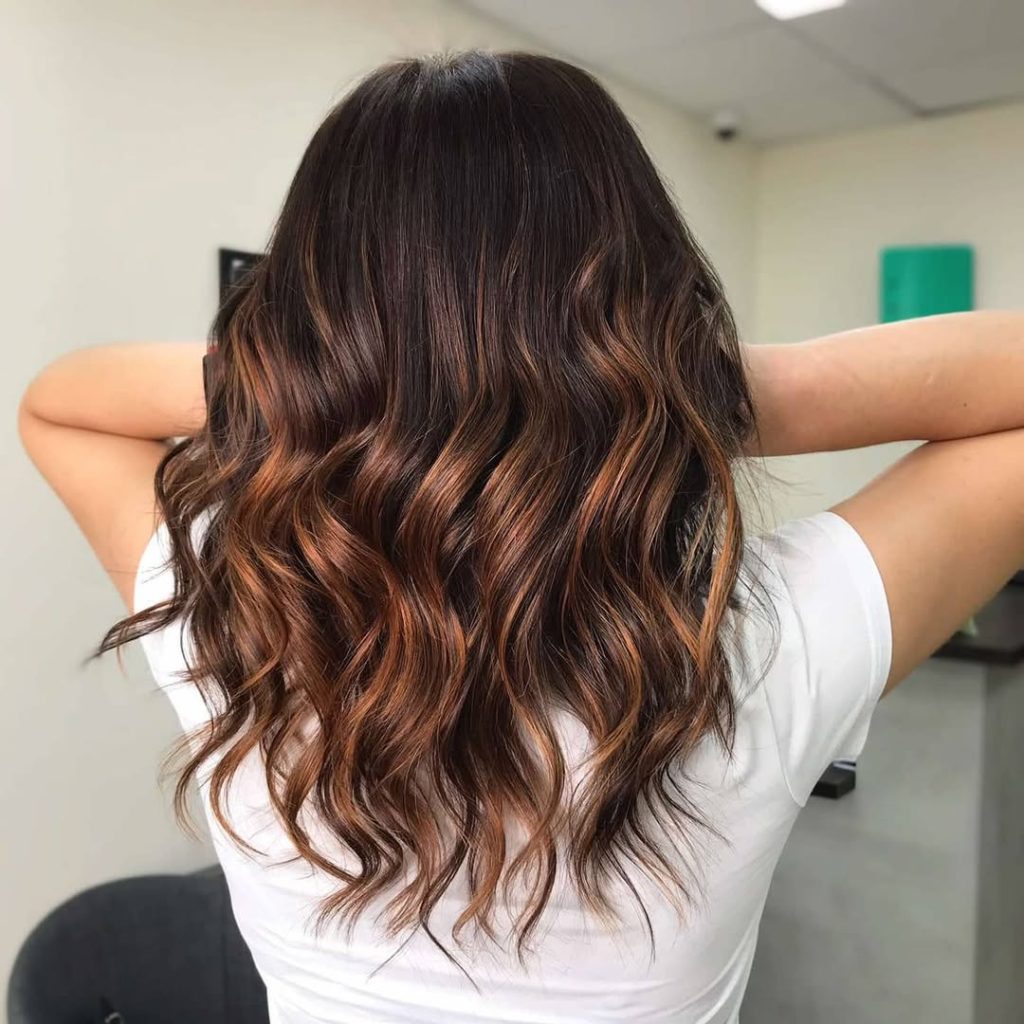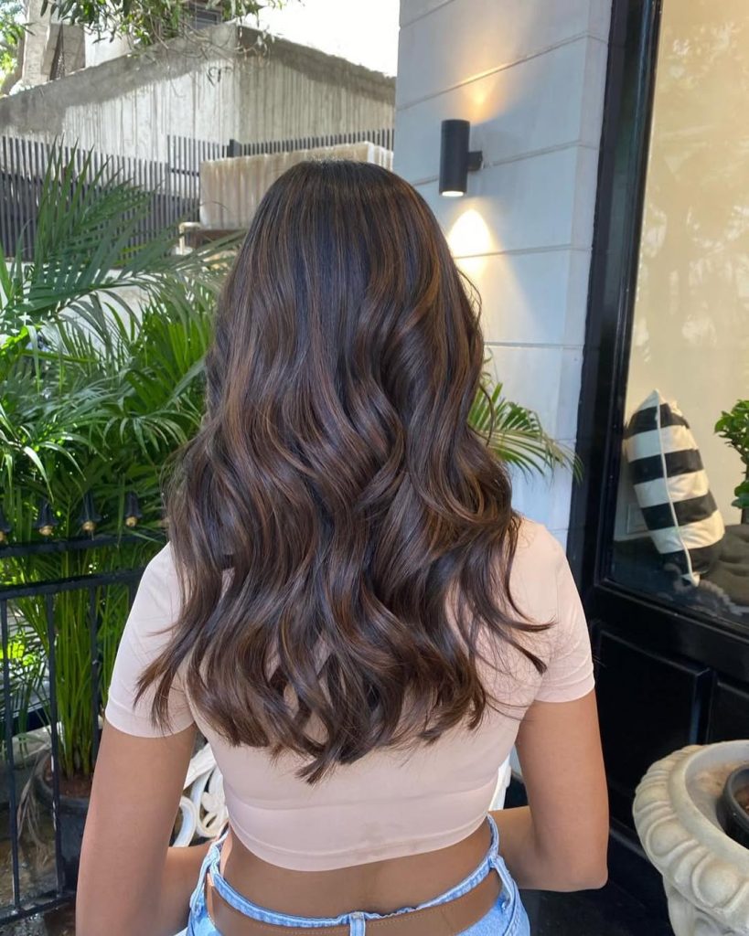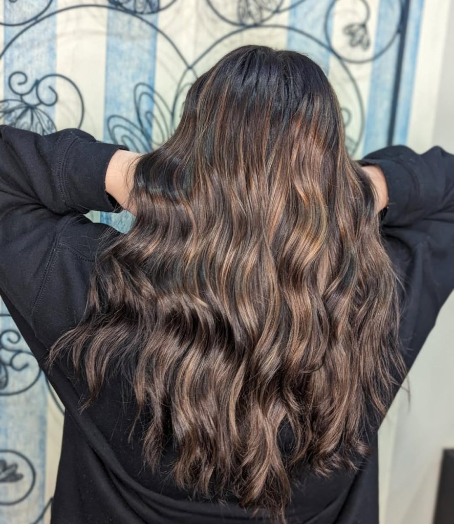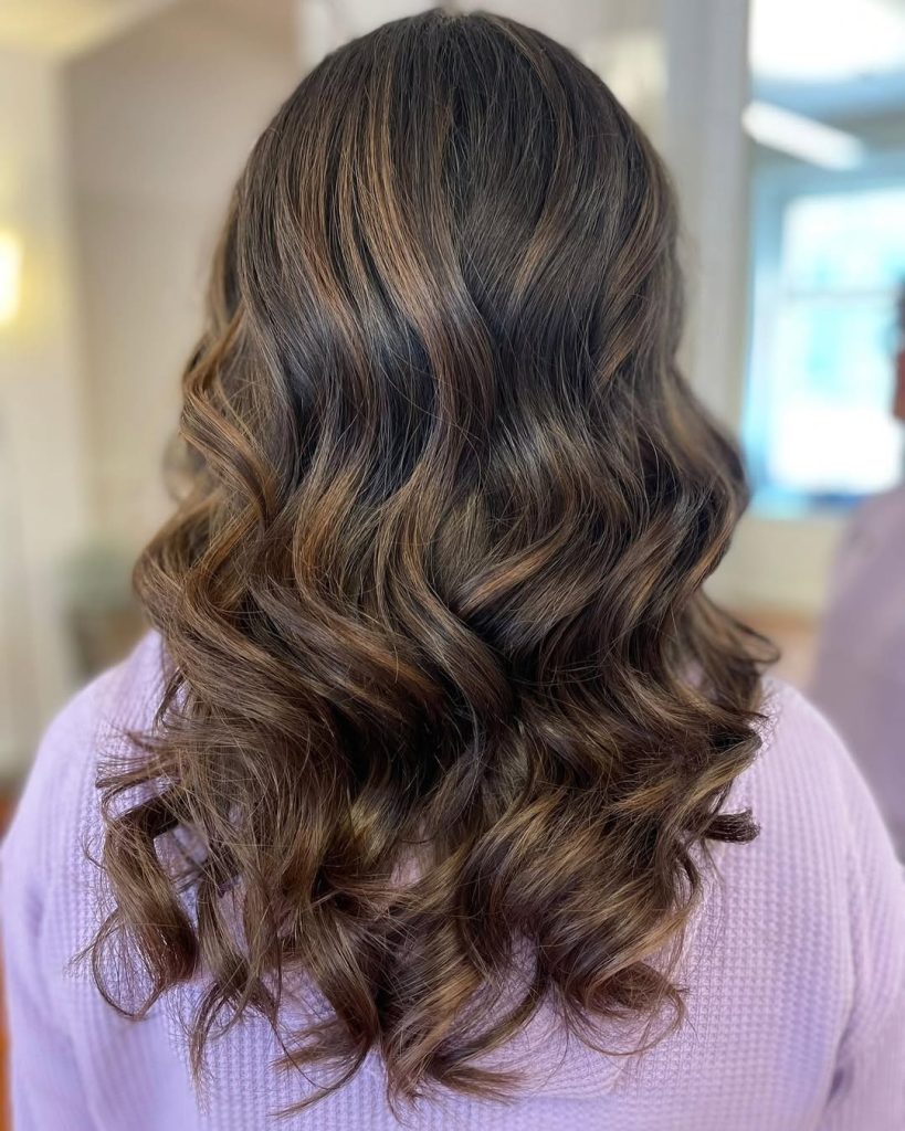 There’s something effortlessly elegant about glossy chocolate brown with delicate lighter strokes woven through. The waves feel soft and touchable, and the overall effect is luminous without being dramatic. It’s the kind of color that looks expensive—polished, dimensional, and perfectly balanced for Summer brunettes who want that subtle glow.