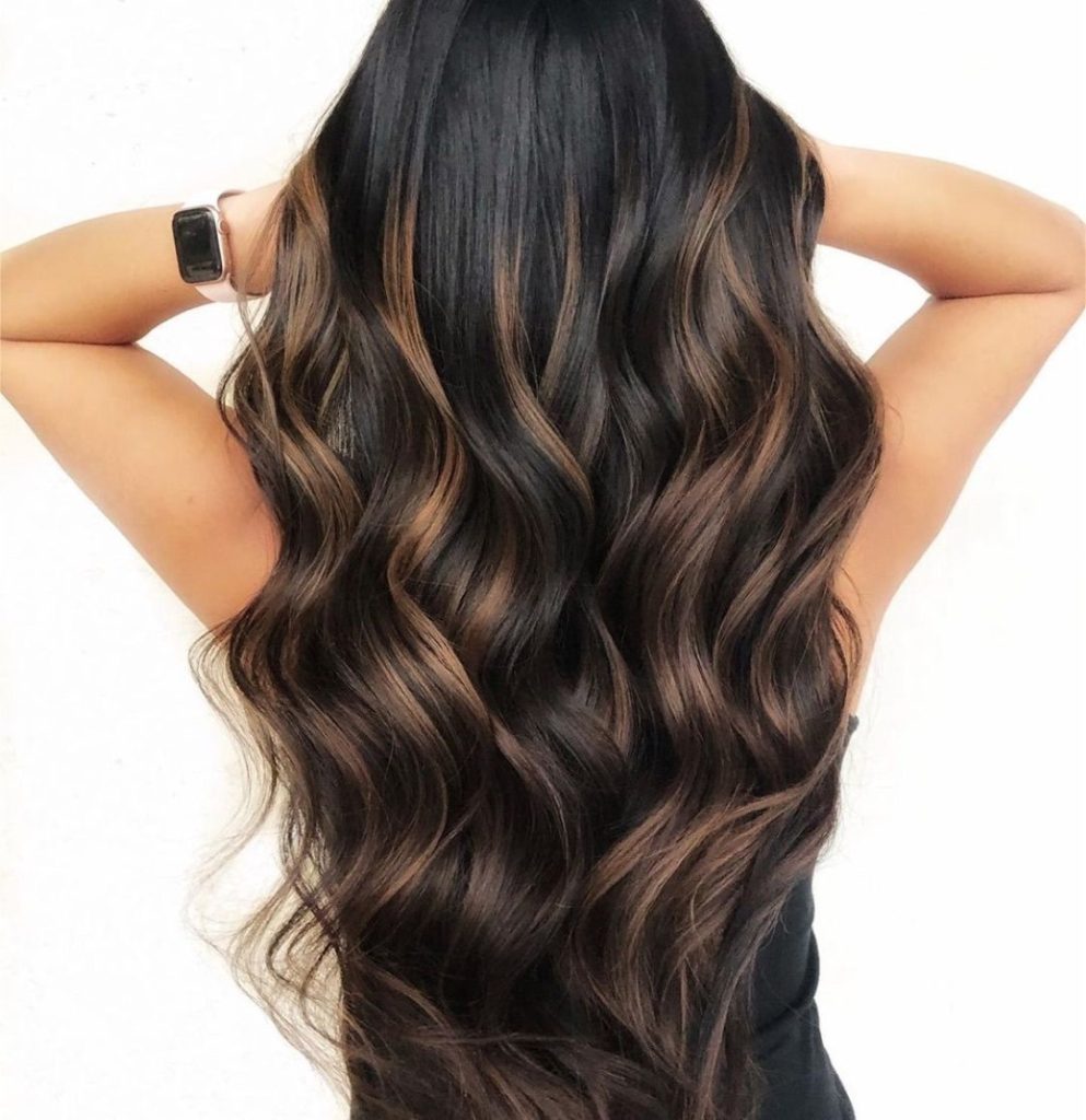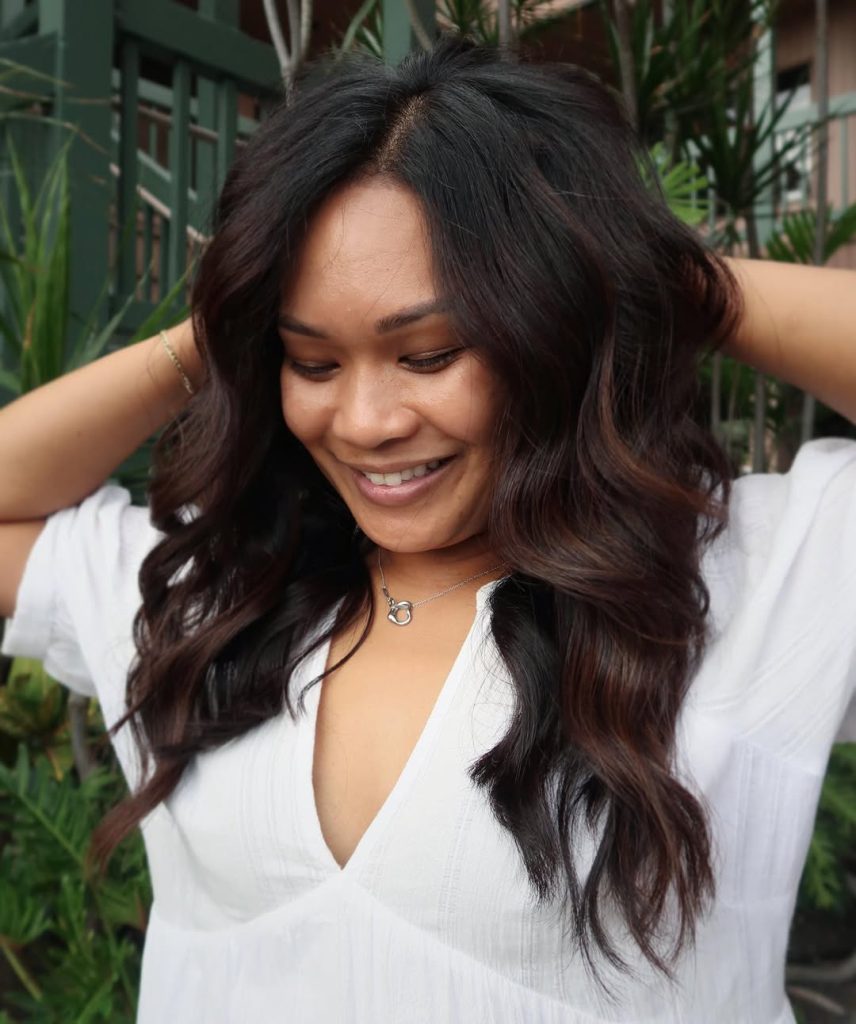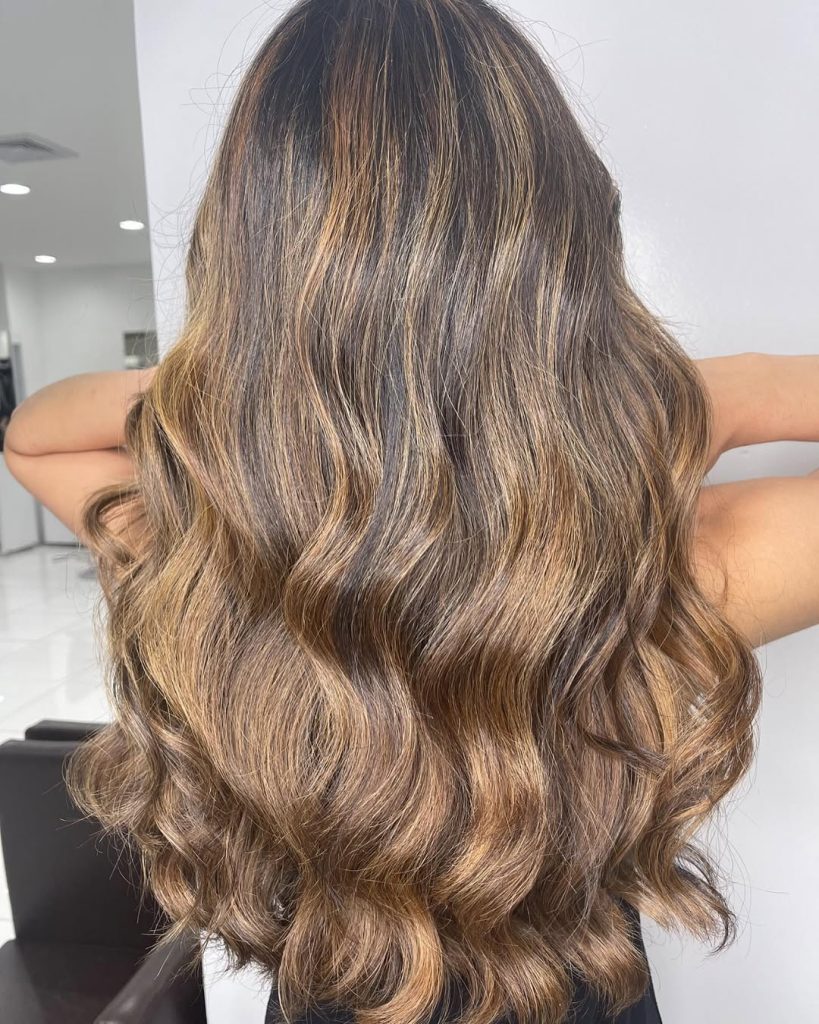 There’s something effortlessly elegant about glossy chocolate brown with delicate lighter strokes woven through. The waves feel soft and touchable, and the overall effect is luminous without being dramatic. It’s the kind of color that looks expensive—polished, dimensional, and perfectly balanced for Summer brunettes who want that subtle glow.