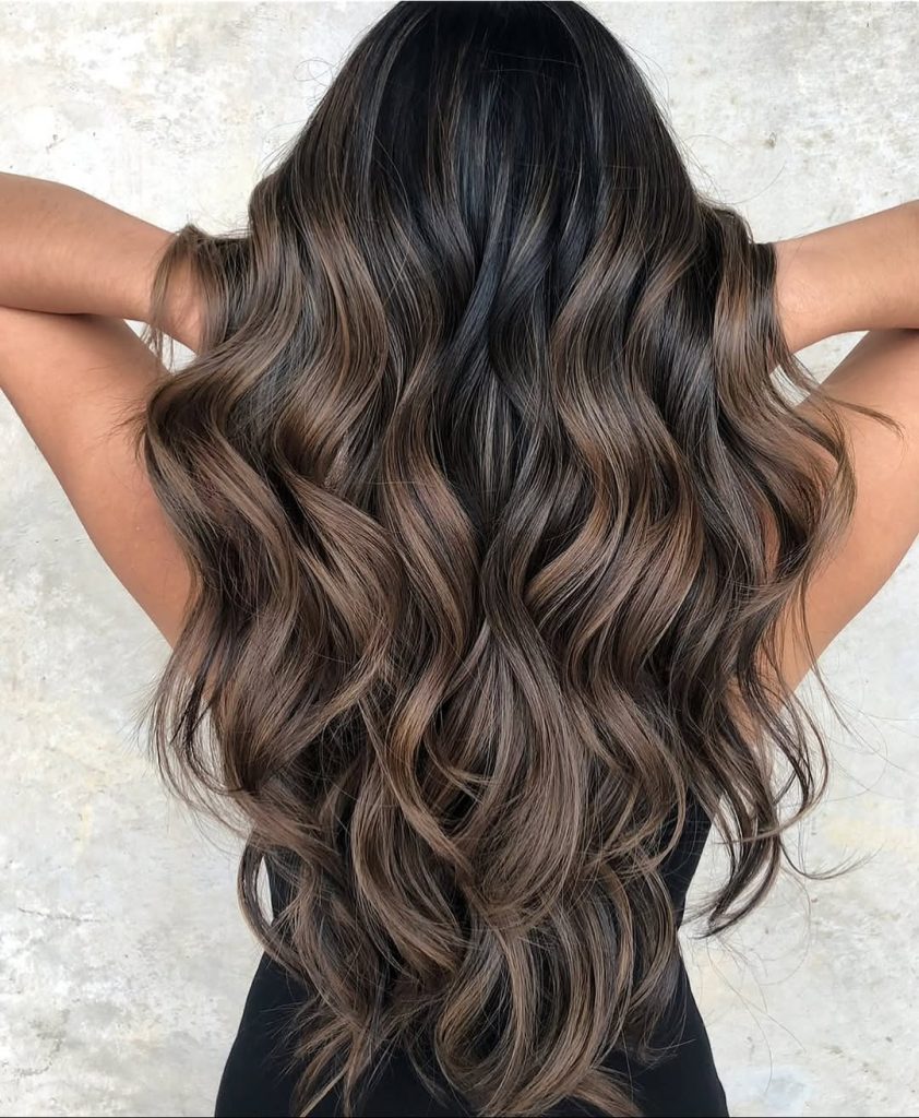 If you lean toward cooler tones, this Ash balayage is effortlessly chic. The soft blonde accents woven through dark brown create a smoky, modern finish that feels incredibly current for 2026. The long Wavy layers amplify the dimension, giving the hair that airy, almost velvety texture. It’s subtle but impactful—like perfectly tailored tailoring in hair form.
