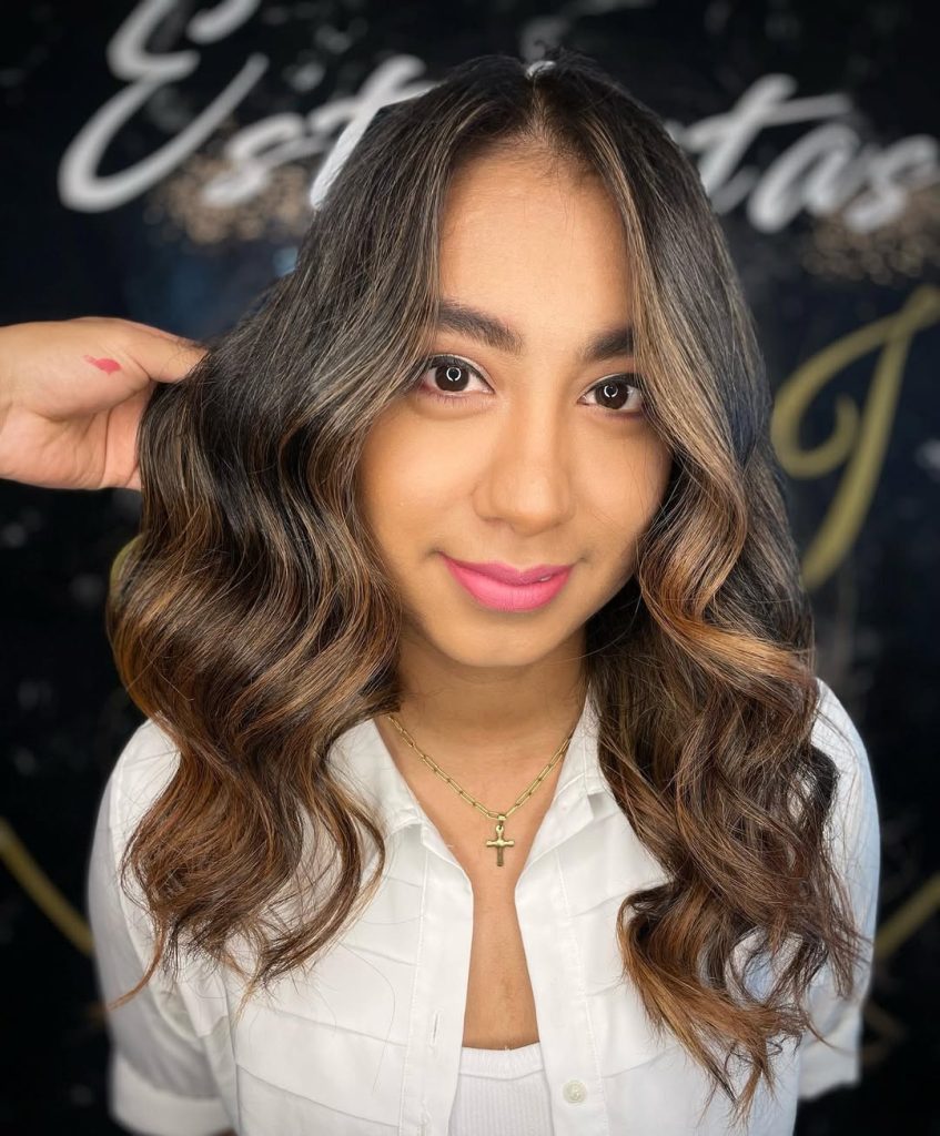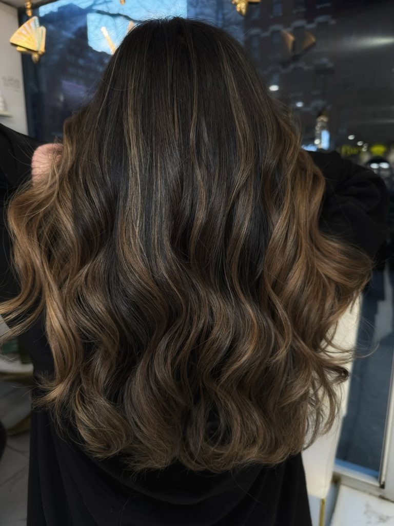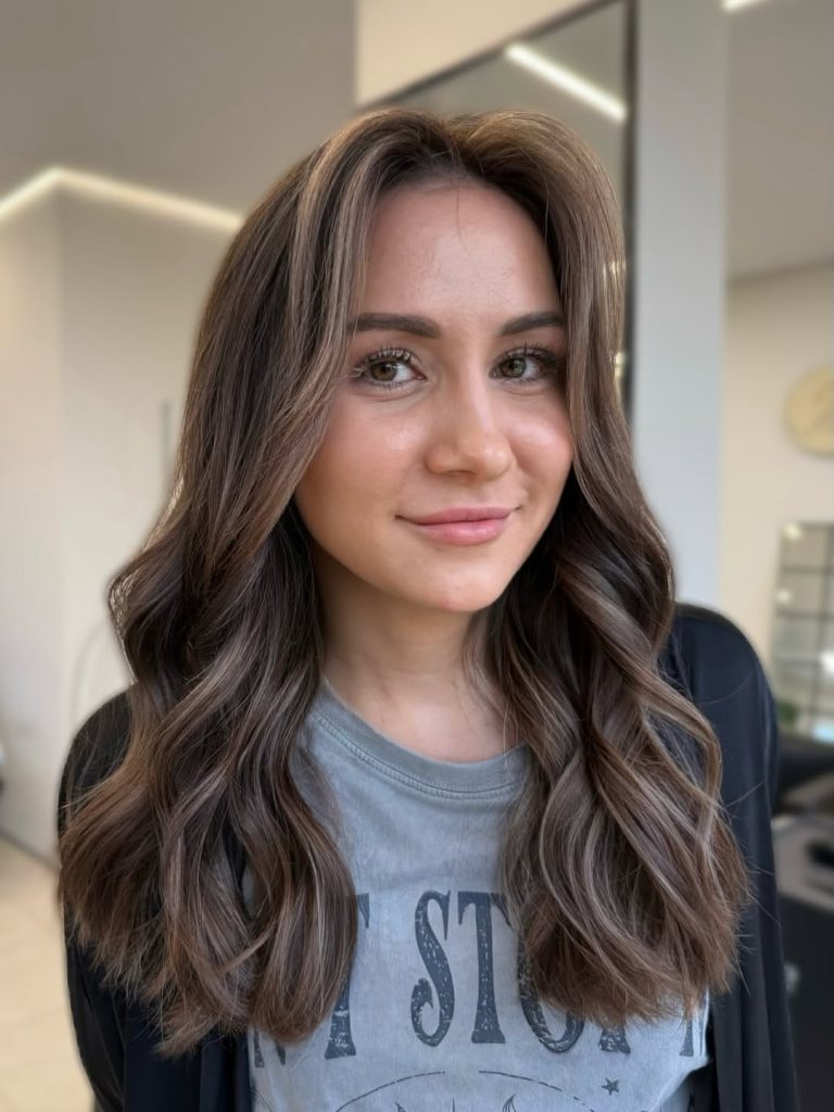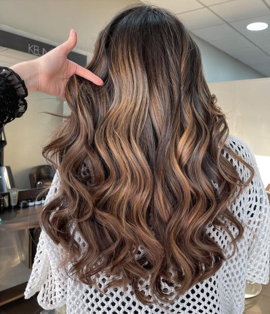 Delicate caramel-blonde ribbons elevate these flowing waves, weaving through the darker base like sunlight through silk. The dimension feels airy and modern, creating movement even when the hair is still. It’s feminine, flattering, and undeniably fresh—a look that instantly softens features while keeping that brunette depth intact.