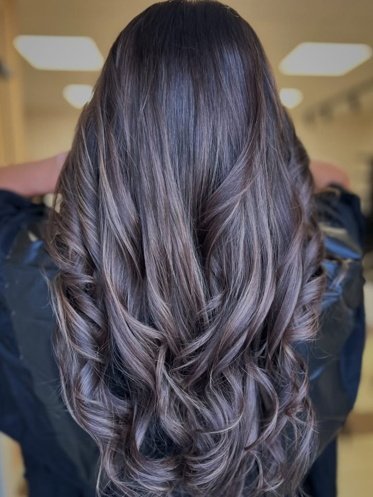 This balayage leans into a cooler Ash direction, giving dark brown hair a smoky, modern twist. The voluminous Wavy texture amplifies the dimension, making the lighter strands pop softly against the deeper base. It feels effortlessly glamorous—dramatic enough to notice, yet still refined and wearable.
