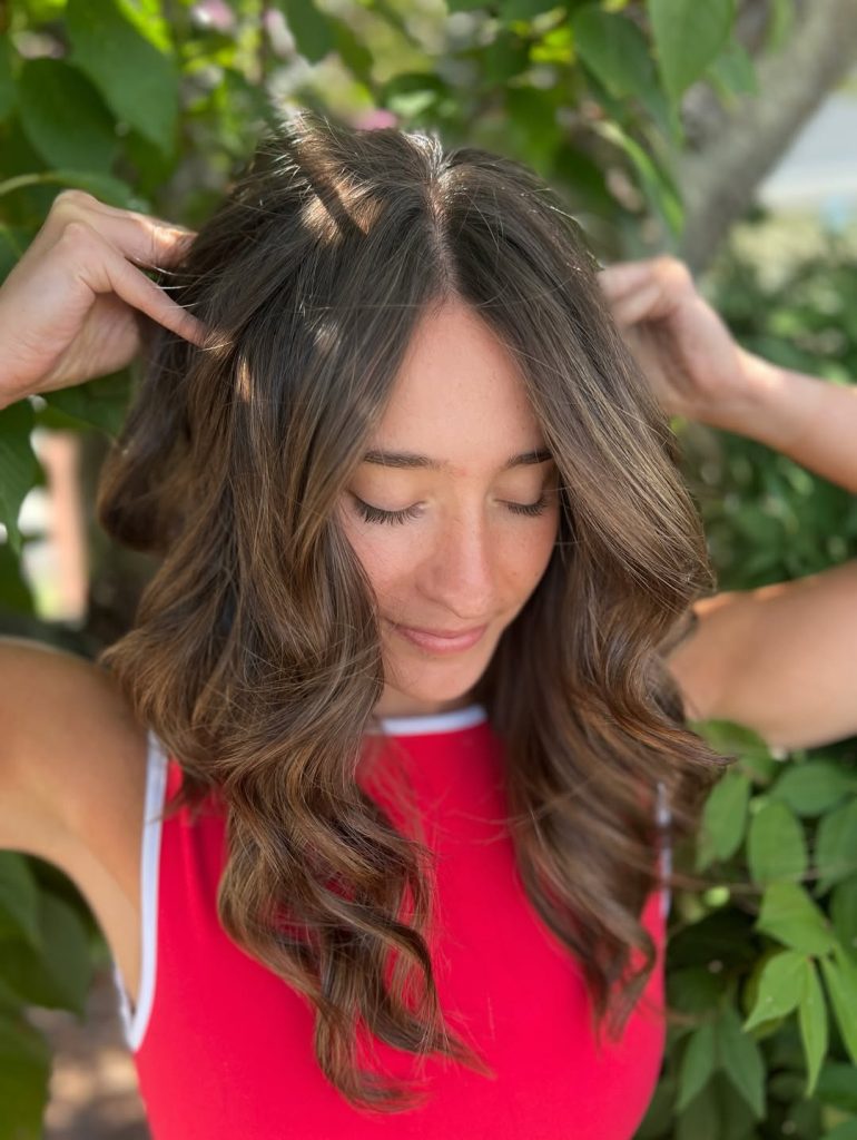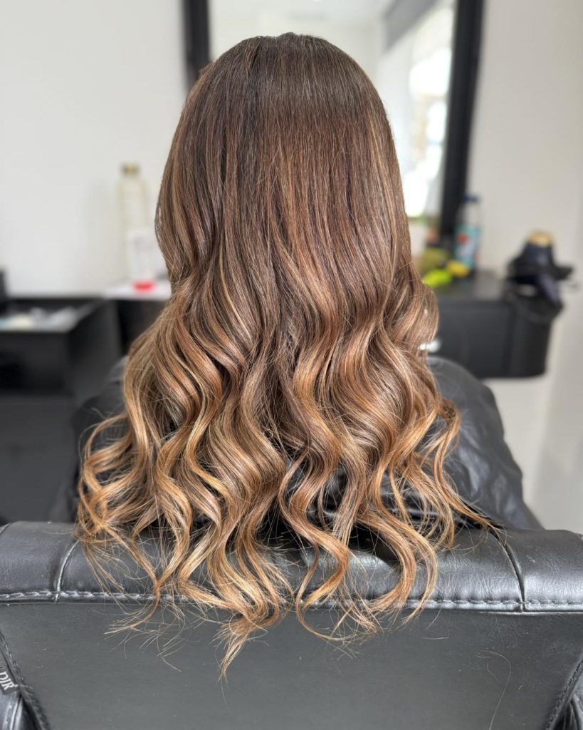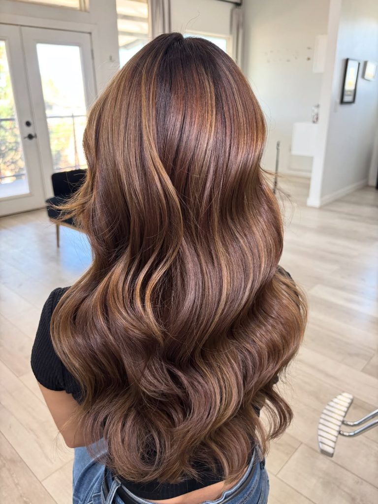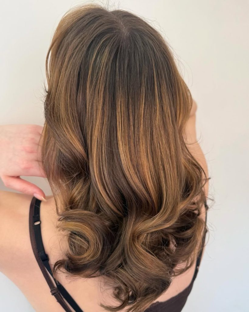 This style has that effortless, “my hair just does this naturally” feeling that so many women are looking for right now. The medium brown base feels soft and wearable, while the caramel highlights glide through the waves in a way that adds warmth without overpowering the look. It feels relaxed and confident, like hair that belongs to someone who knows exactly who she is and doesn’t need to try too hard to prove it.