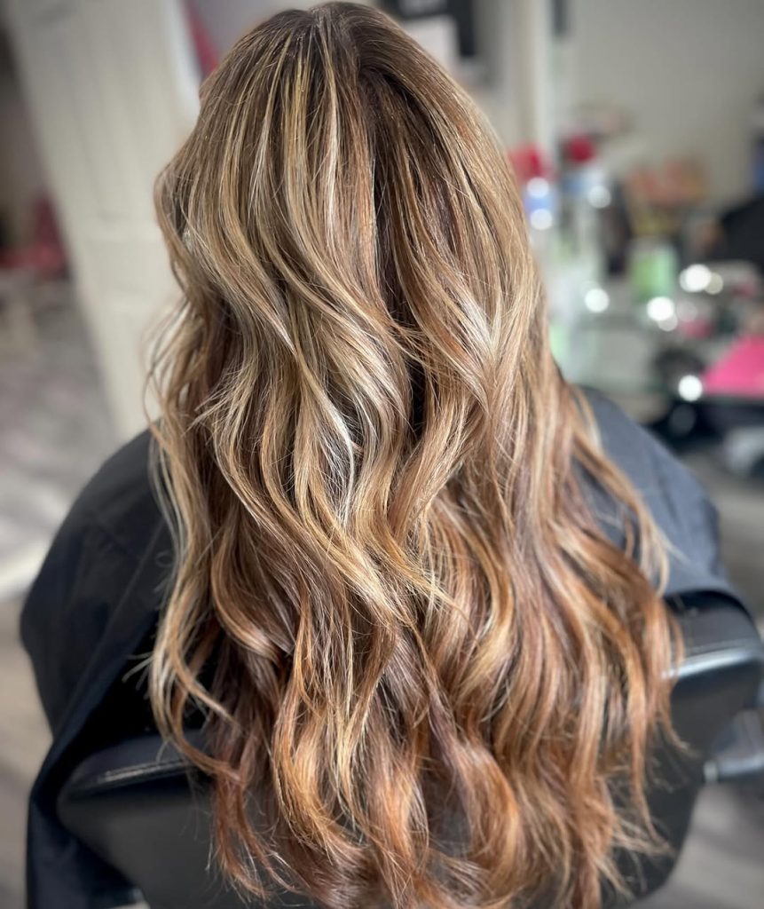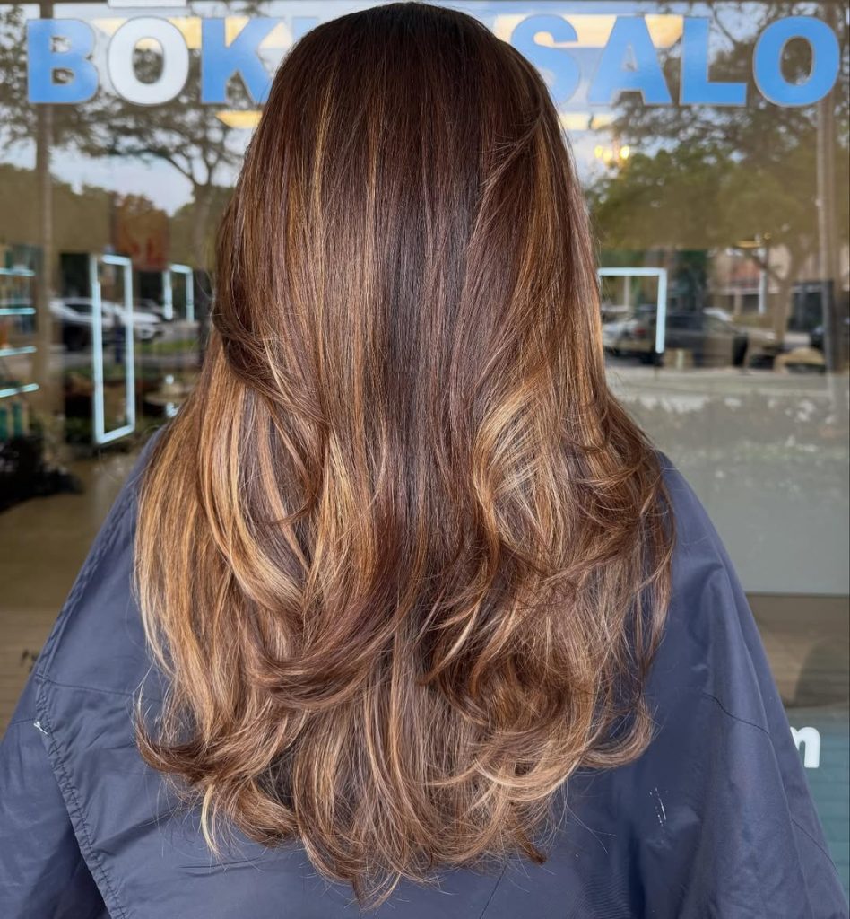 Long brown hair never goes out of style, but these golden highlights bring a sense of lightness that feels youthful and fresh. The warmth through the mid-lengths and ends softens the overall look, while the layers create flow and movement that keeps the style from feeling heavy. It’s elegant, approachable, and full of natural charm.