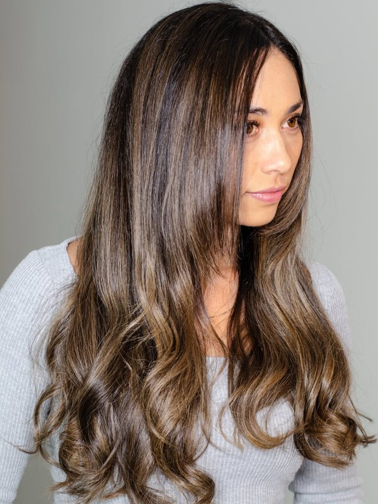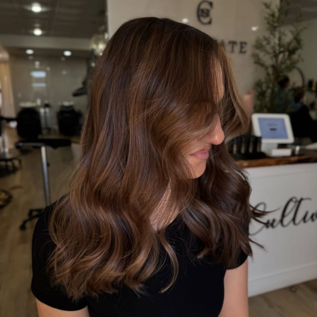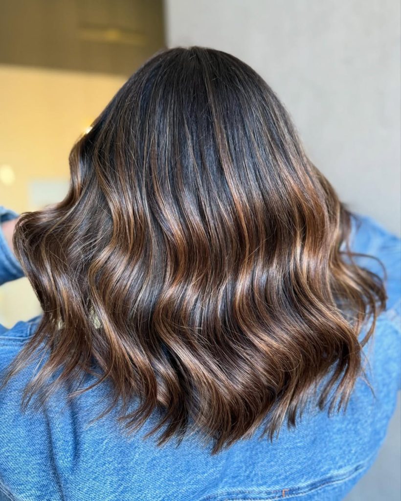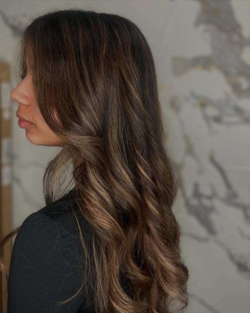 This option works especially well for women who want to keep their hair on the darker side but still crave dimension. It’s flattering on medium to thick hair and ideal for wavy or straight textures that hold soft movement. Styling is simple: loose waves enhance the contrast, while a smooth blowout gives it a more polished, elegant finish.