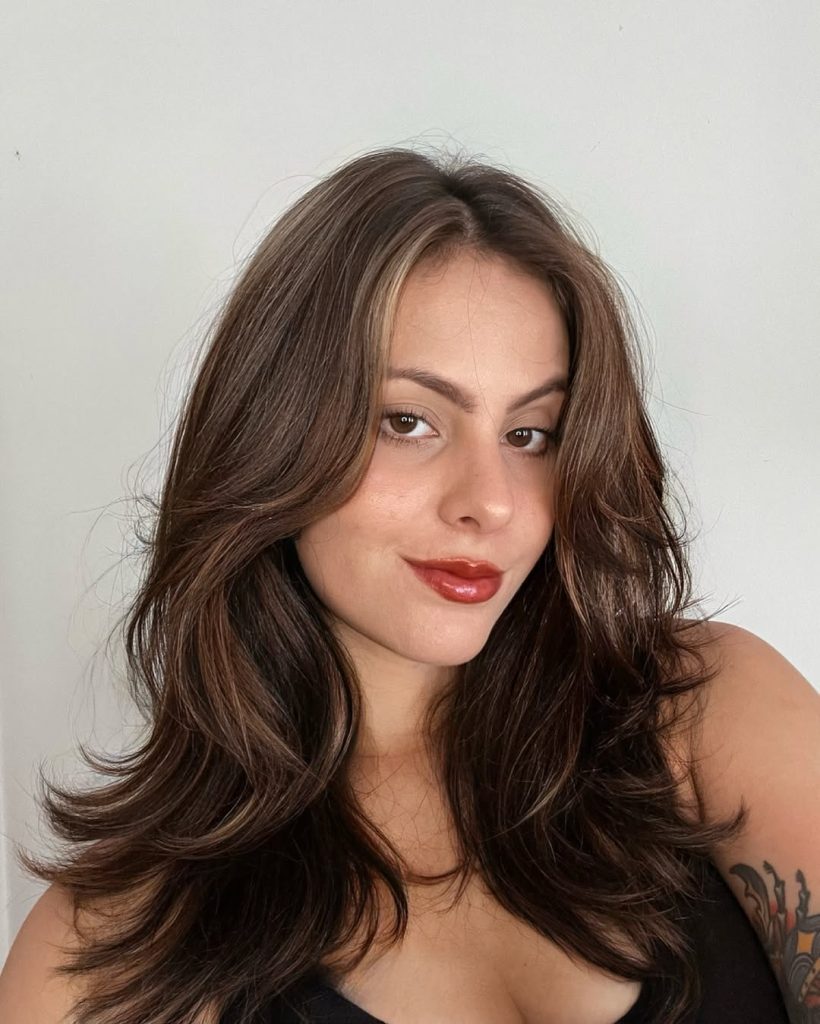 If your hair is naturally straight or slightly wavy, this style enhances shine and creates visual movement without relying on dramatic layers. It’s especially great for women who want to keep their brown but avoid a flat, single-tone finish. A round-brush blowout or loose curling iron work brings out the caramel tones, while the darker base keeps the look grounded and easy to maintain.
