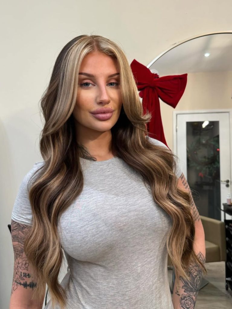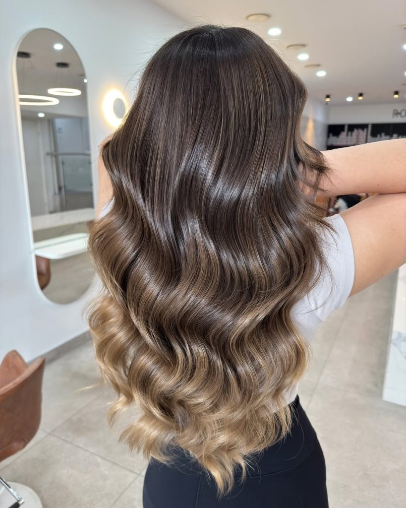 This style feels rich, warm, and quietly luxurious. The chocolate brown base creates depth, while golden balayage highlights add lightness through the mid-lengths and ends. The soft waves give the hair a relaxed flow that feels natural and flattering, framing the face without looking styled to perfection. It’s an effortless kind of beauty that feels very now.