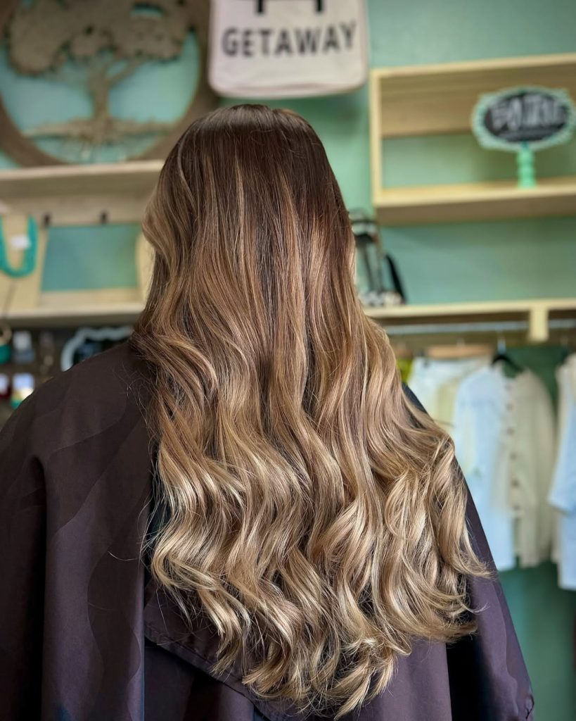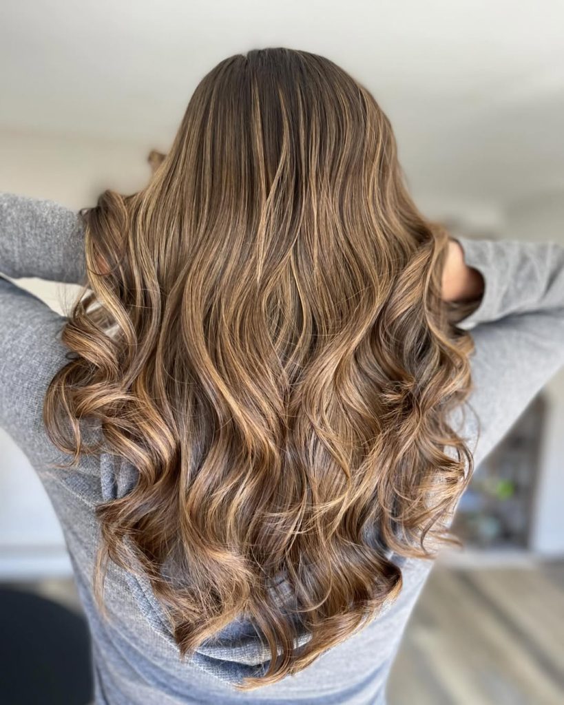 This hairstyle feels relaxed and wonderfully balanced. The brown base is dominant, and soft blonde highlights feel grown in. The long waves add movement and romance, a look that feels effortless but polished.