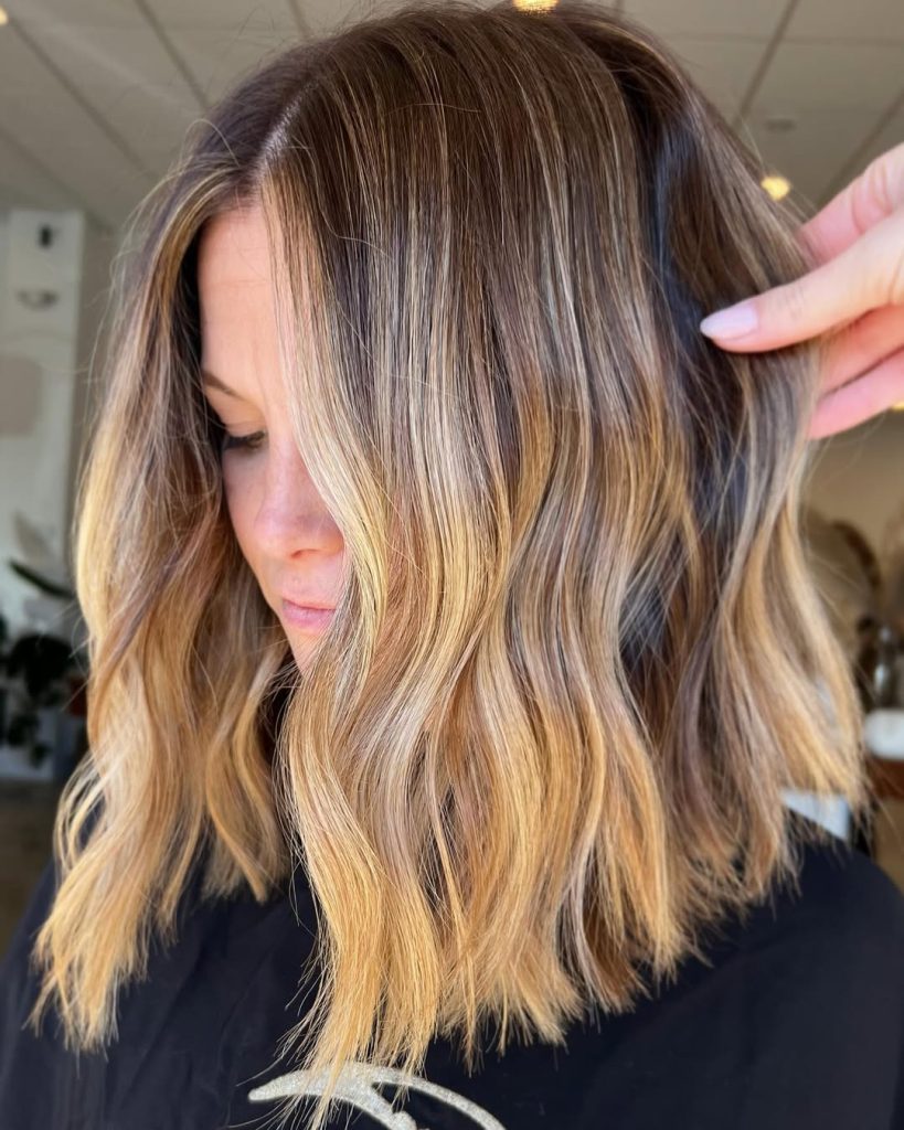 This style works especially well for women with medium shoulder-length layered hair who want dimension without harsh contrast. The balayage technique blends dark and light tones gently, making regrowth less noticeable and maintenance more forgiving. It’s ideal for fine to medium hair that benefits from visual fullness, and it styles beautifully with a large curling iron or soft air-dried waves. A light styling cream enhances the natural wavy finish without weighing it down.