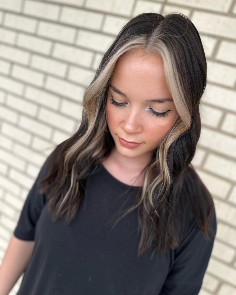 This look feels fresh, youthful, and just a little daring. The dark brown base keeps things grounded, while the light blonde front pieces brighten the face instantly. It draws attention upward, giving the hair a modern edge without committing to full highlights. The soft waves that run through the length keep the style balanced and easy to wear.