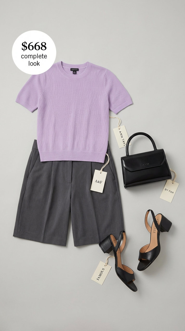This combination is one of our favorite summer business casual outfits women can adapt for the office. It pairs sophisticated charcoal gray tailored shorts ($59.50) with a soft lavender knit top ($32.49), grounded by classic black block-heel sandals ($55.99). The Bermuda shorts are cut from a Tencel blend, and their longer length makes them appropriate for more relaxed professional settings like a summer work event. The stitched sweater tee adds a comfortable texture and a contemporary pop of color to the otherwise neutral palette.