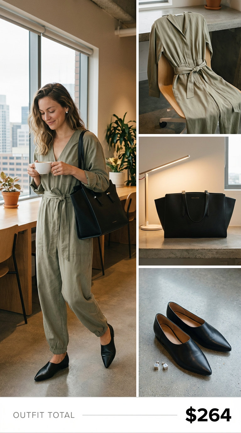 While loafers are fantastic, the right kitten heel can be just as versatile for your work wardrobe. This outfit is one of those effortless summer outfits that are suitable for business casual office days, client lunches, and even work travel. The hero piece is an olive green Tencel-blend jumpsuit ($39.99). The Tencel fabric is key, offering a breathable quality perfect for warmer weather, while the included tie belt expertly cinches the waist to create a flattering and defined silhouette. It’s paired with black kitten heel mules ($63.99) made of genuine leather, which are easy to slip on and add a polished finish without sacrificing comfort.