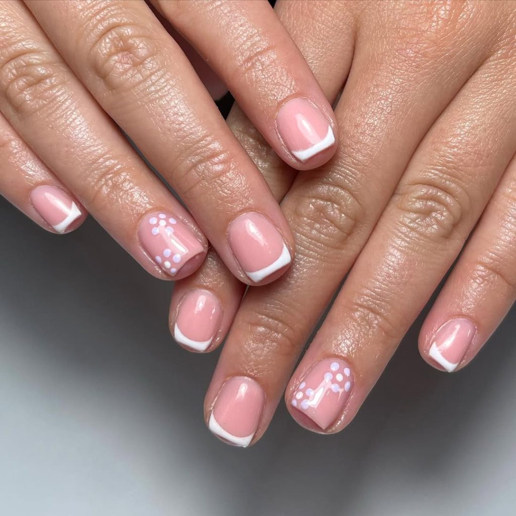 1. Soft pink French tips adorned with playful dots create a cozy look.