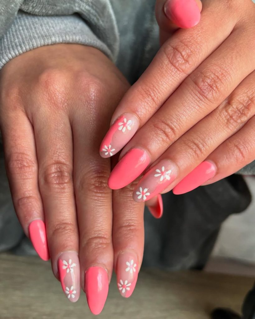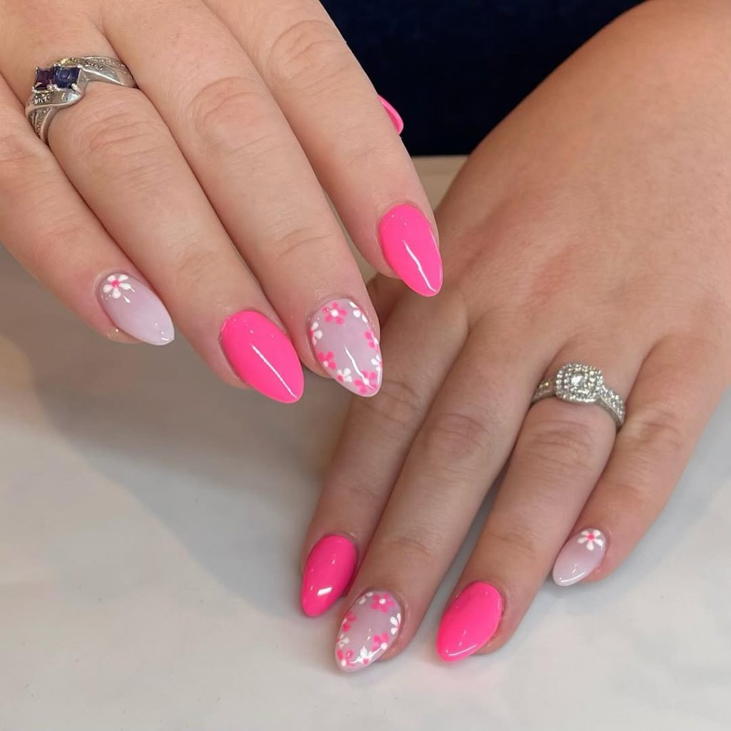 6. Hot Pink Almond Nails with Tiny Floral Accents