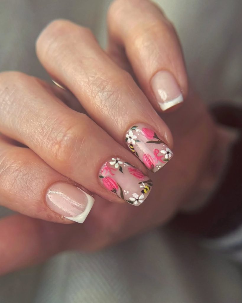 16. The design features short pink nails adorned with cute bee and daisy art.