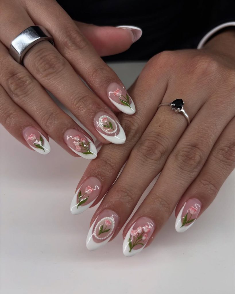 14. Elegant Almond French Tips with Delicate Floral Accents