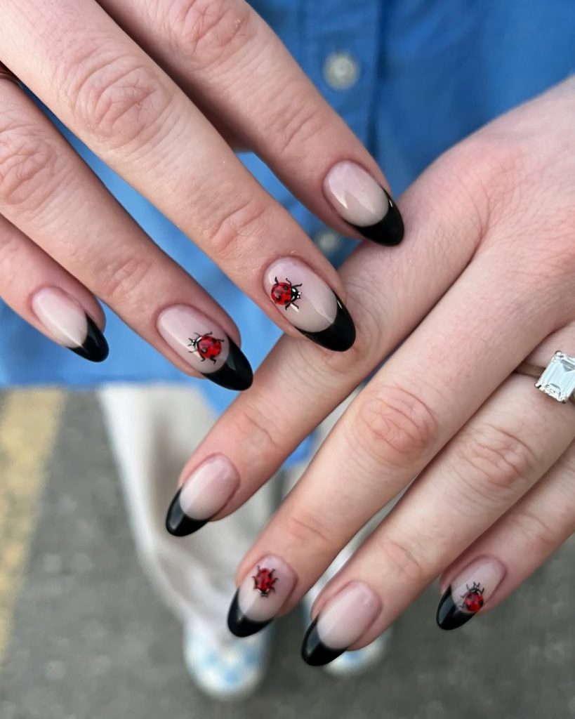 15. Black French Tip Almond Nails with Cute Ladybug Art