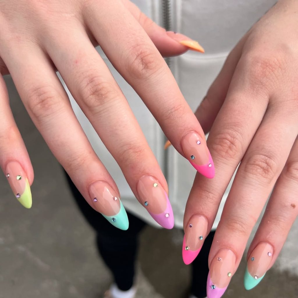 17. Pastel Almond Nails with Soft Color Tips and Rhinestones