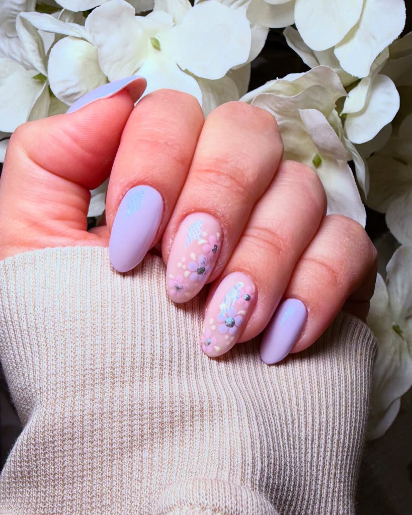 These nails feel calm, cozy, and beautifully balanced. The lavender tone is soothing and elegant, while the soft texture and tiny accents give the design depth without overpowering it. It’s understated spring beauty at its best—gentle, feminine, and effortlessly stylish.