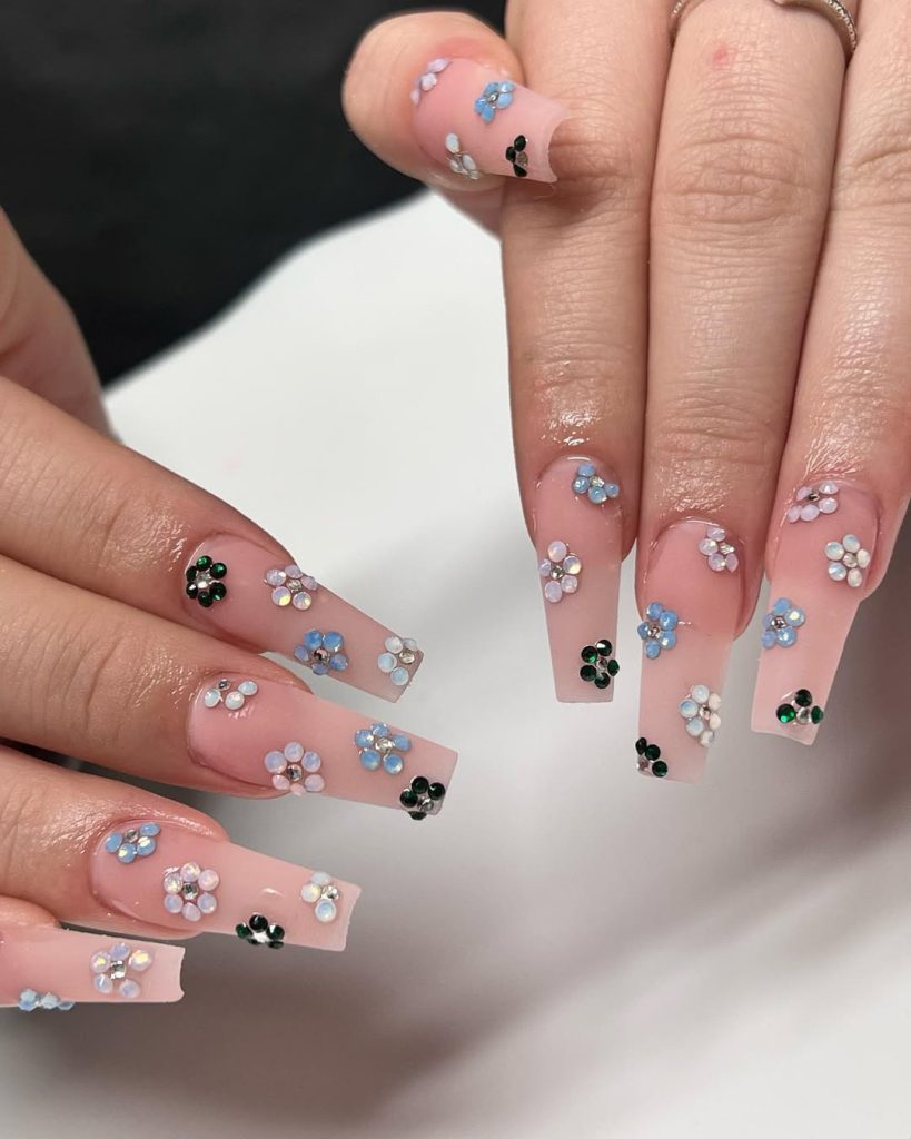 This manicure feels like a tiny spring garden at your fingertips. The delicate flowers bring a joyful, playful energy, while the soft nude base keeps everything looking balanced and wearable. It’s feminine without being too precious and bold without feeling loud. If you love nails that spark compliments and smiles, this one definitely delivers that feel-good Inspo.