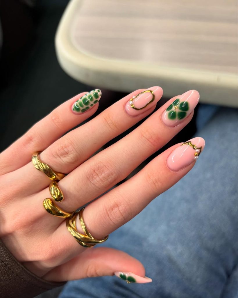 21. Nude Almond Nails with Green Leaf Art and Gold Accents
