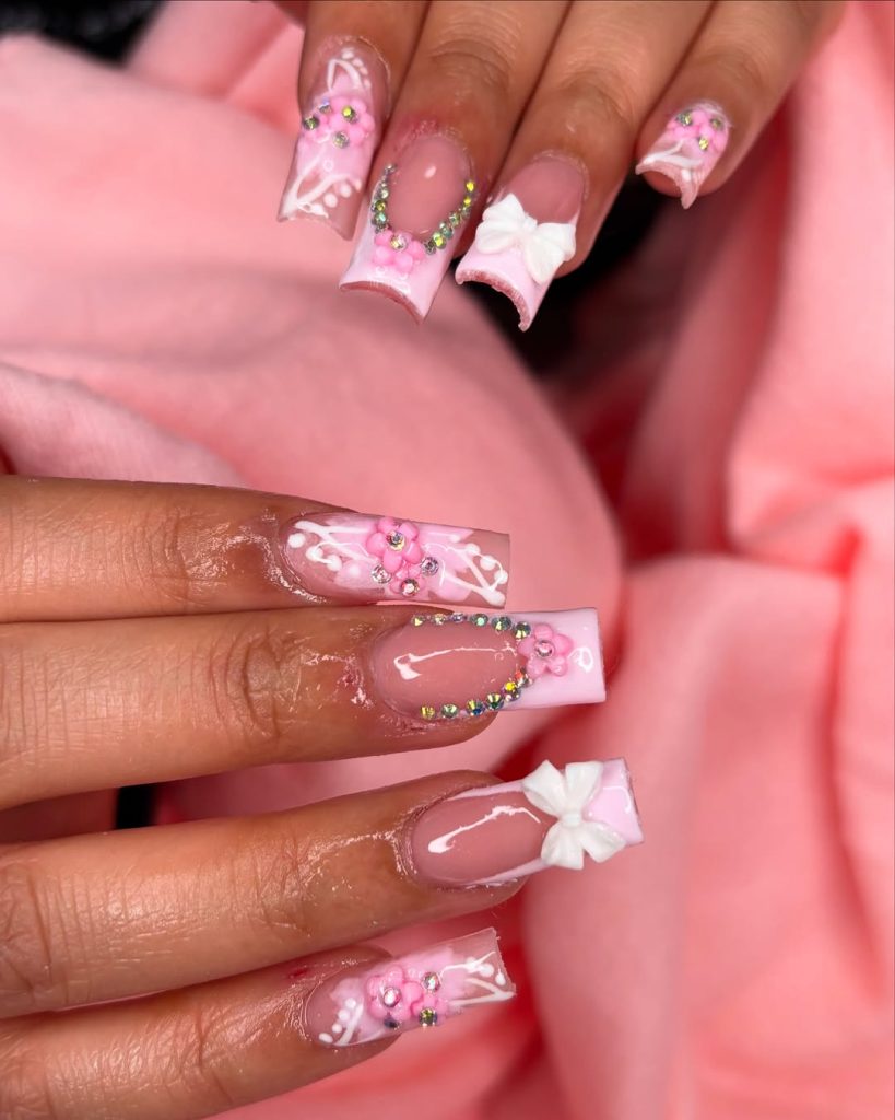 22. Pink Acrylic Coffin Nails with 3D Bows and Rhinestones