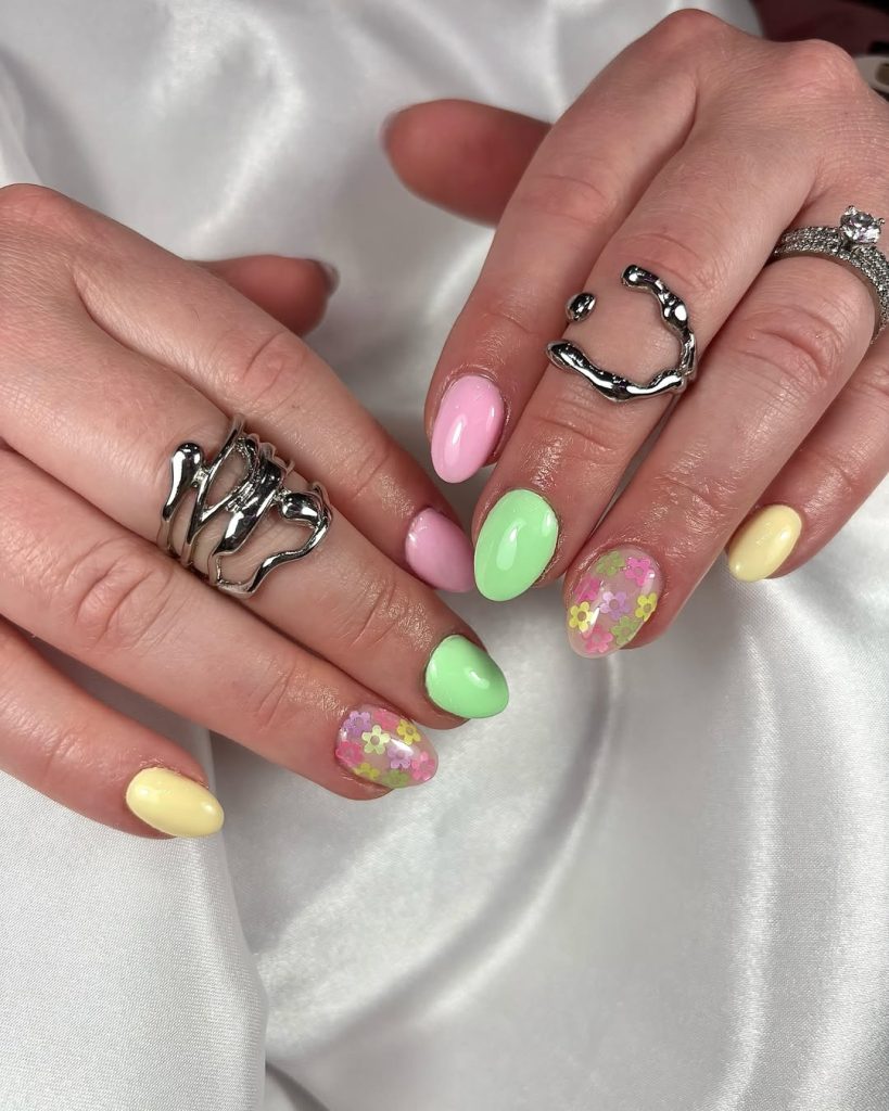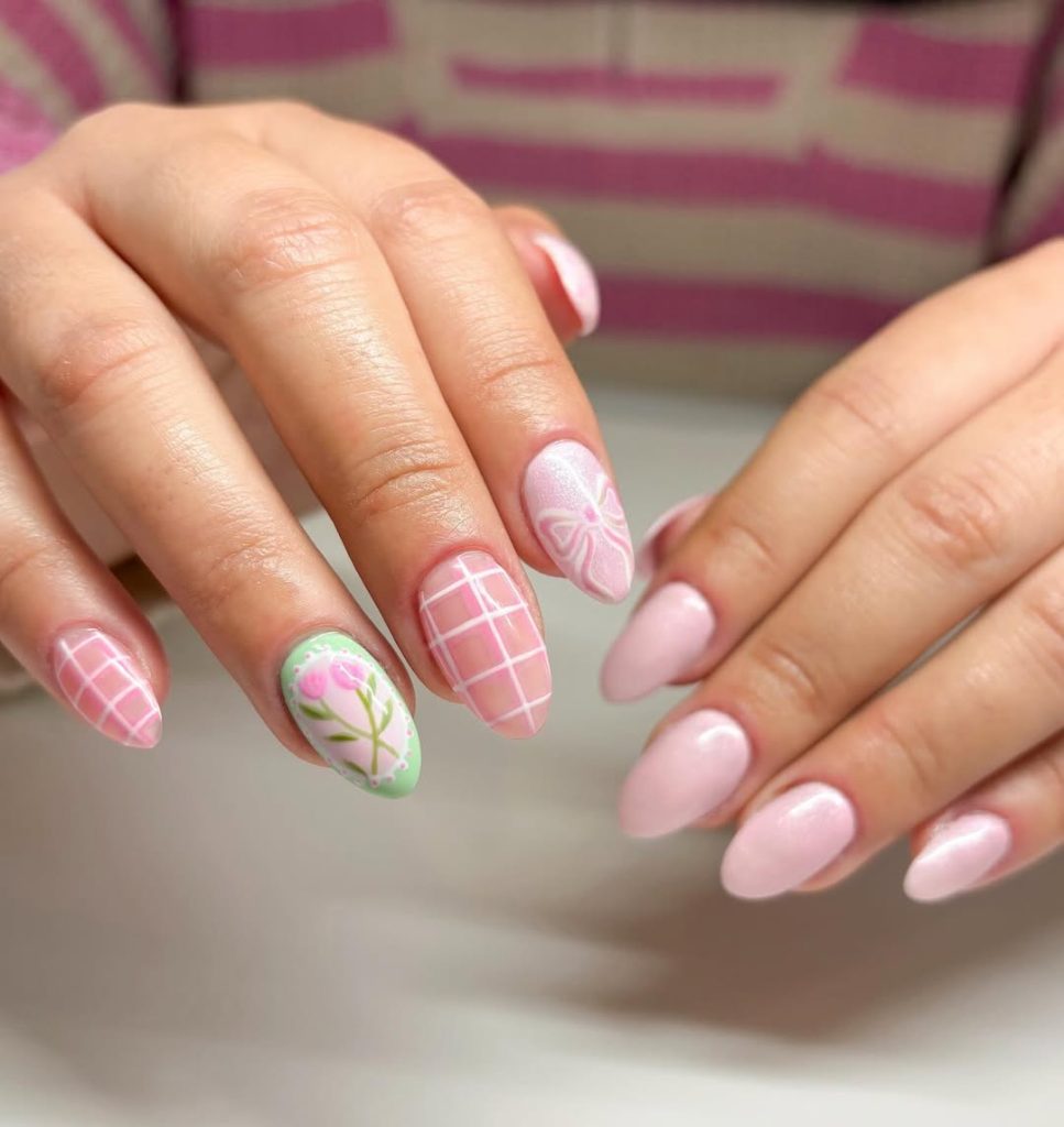 These nails feel light, fresh, and quietly adorable. The mix of mint and soft pink creates a playful spring palette, while the tiny floral detail adds a sweet, almost whimsical touch. It’s the kind of manicure that feels cozy and joyful, perfect for everyday spring moments.
