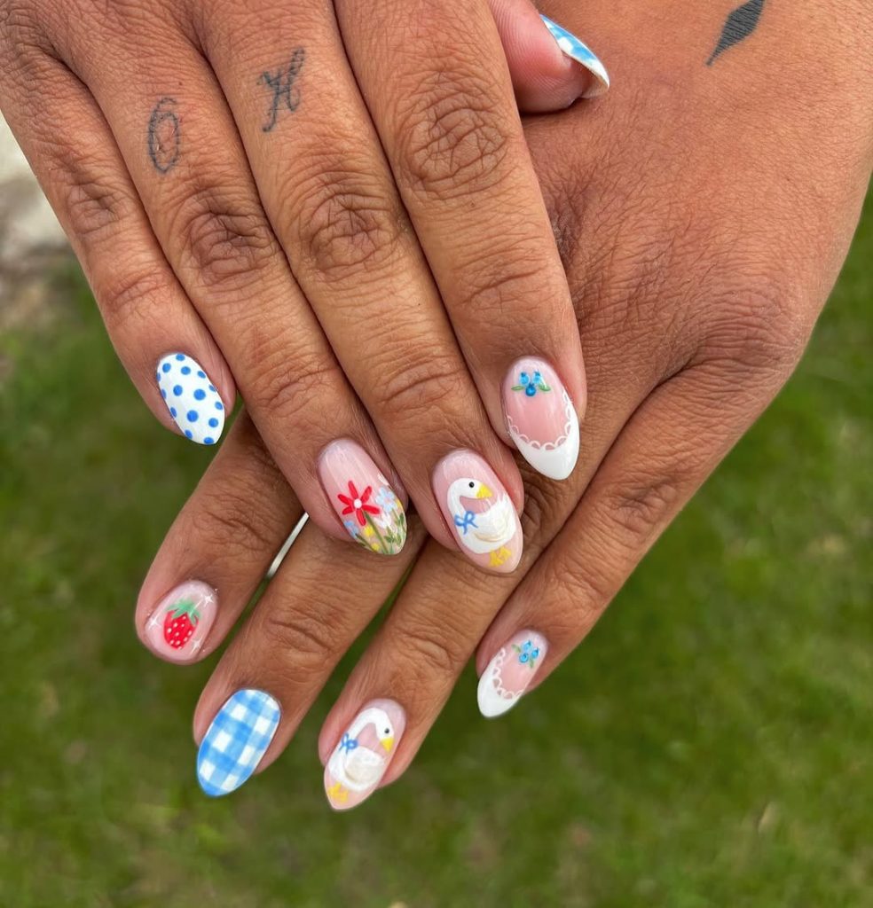 This manicure is spring happiness in a nutshell. From gingham patterns to mini ducks, flowers, and small fruit, every nail is like its own mini illustration. And it’s playful, creative, and full of personality—an ideal way to embrace the whimsical side of spring.
