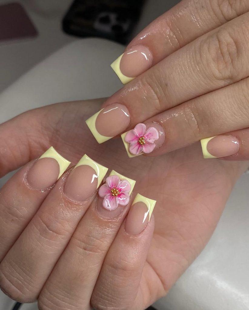 19. Yellow French Tip Almond Nails with Floral Pattern
