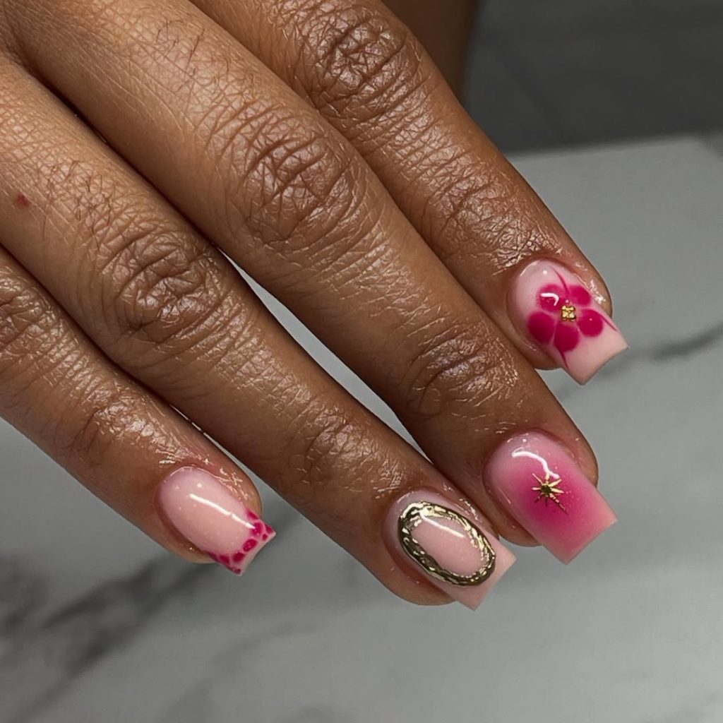 This manicure feels bold, cheerful, and unapologetically joyful. The vibrant pink shade instantly lifts the mood, while the small floral details soften the look and keep it playful rather than overpowering. It’s the kind of spring design that feels confident but still sweet—perfect for days when you want your nails to match your energy and optimism.