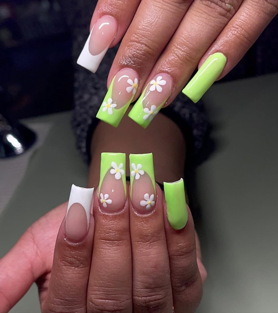 This square is a wonderful option if you want to try out a shape that’s structured and holds its form. The minimal solid-color accents and flower art make it seem contemporary without being trendy for one season. It’s particularly flattering on acrylic nails of a medium length and would look gorgeous if you’re after almond-shaped ideas that still look modern and are easy to maintain.