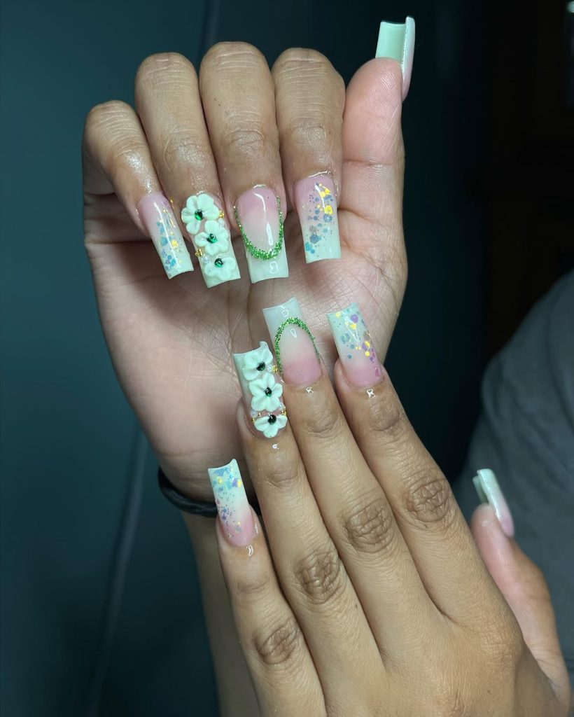 These nails feel like a breath of fresh air. The soft mint tone paired with floral art creates a calming, elegant spring vibe that feels both modern and romantic. There’s something soothing about this color palette—it’s eye-catching without being loud and beautifully balanced.