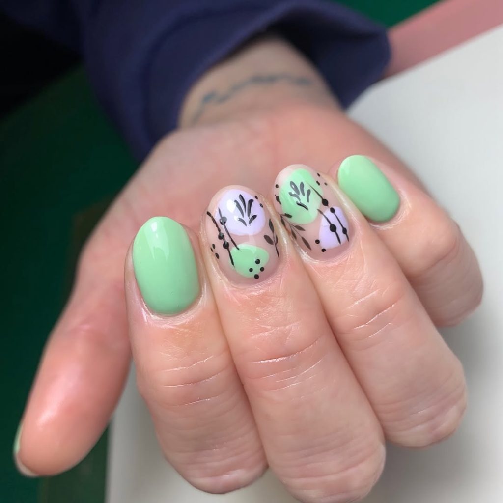 This manicure exudes a demure elegance that feels very contemporary. A soft green base combined with delicate botanical lines reads as natural and organic, the way fresh leaves in early spring would be. It’s subtle, calming, and easy to wear for those who favor unfussy, plain designs.