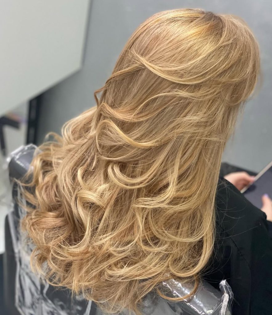 This look has a quiet drama to it—full, flowing, and beautifully balanced. The dirty blonde color leans slightly warm, giving the hair a soft golden glow without tipping into brassy territory. The volume feels intentional but not overdone, creating a confident, elegant silhouette that holds its shape while still moving naturally.