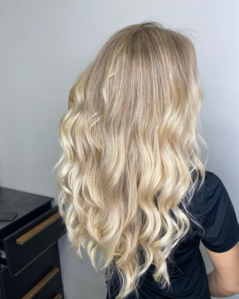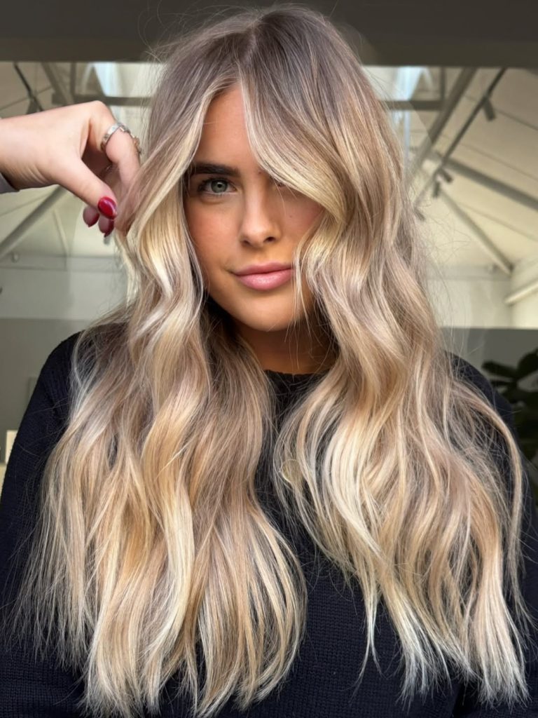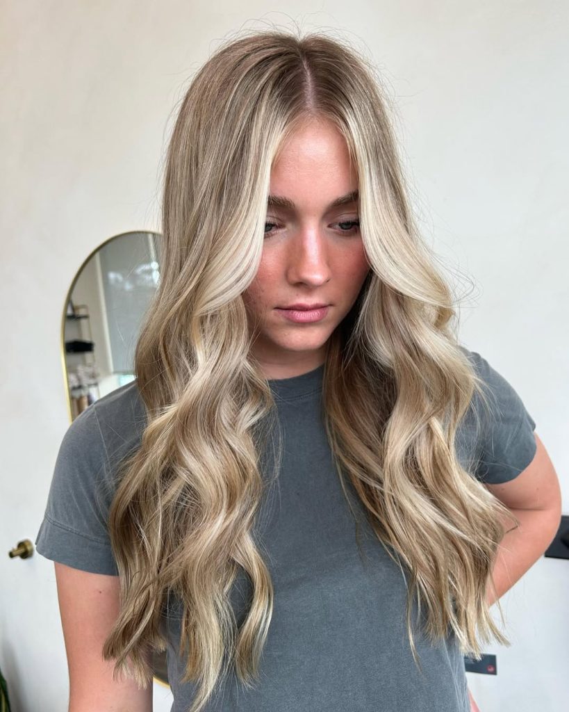 This long dirty blonde style feels luxurious without being flashy. The gentle blonde balayage creates a sun-kissed effect that looks expensive but understated. The color melts beautifully from darker roots into lighter ends, giving the hair a smooth, flowing look. It’s the kind of hair that makes you stand a little taller—polished, confident, and quietly glamorous.