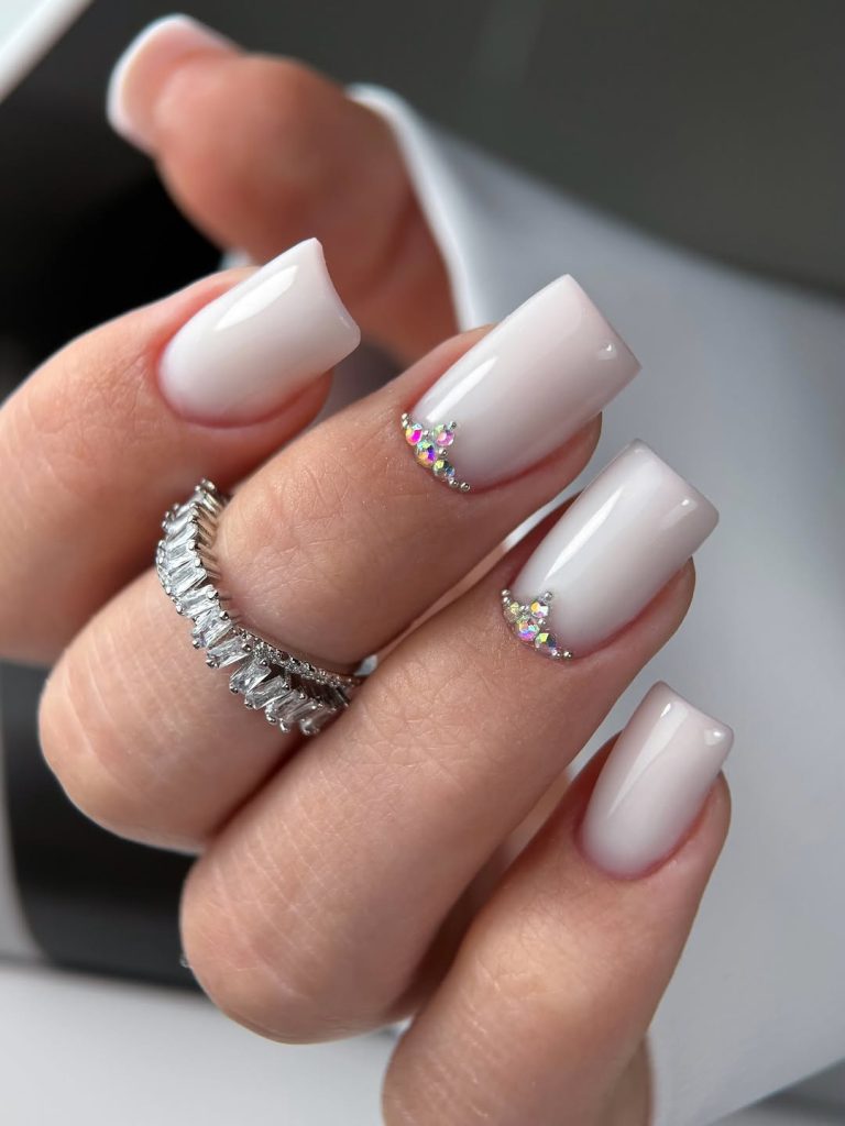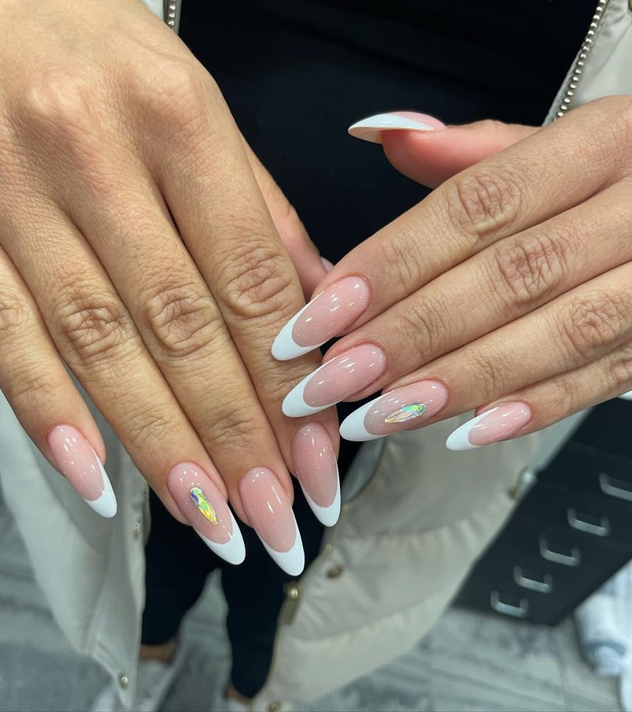 This manicure feels refined and quietly special, like a favorite piece of jewelry you wear every day. The soft pink base keeps everything gentle and feminine, while the crisp white French tips add structure and elegance. The tiny crystal accent catches the light just enough to feel luxurious without ever feeling showy.