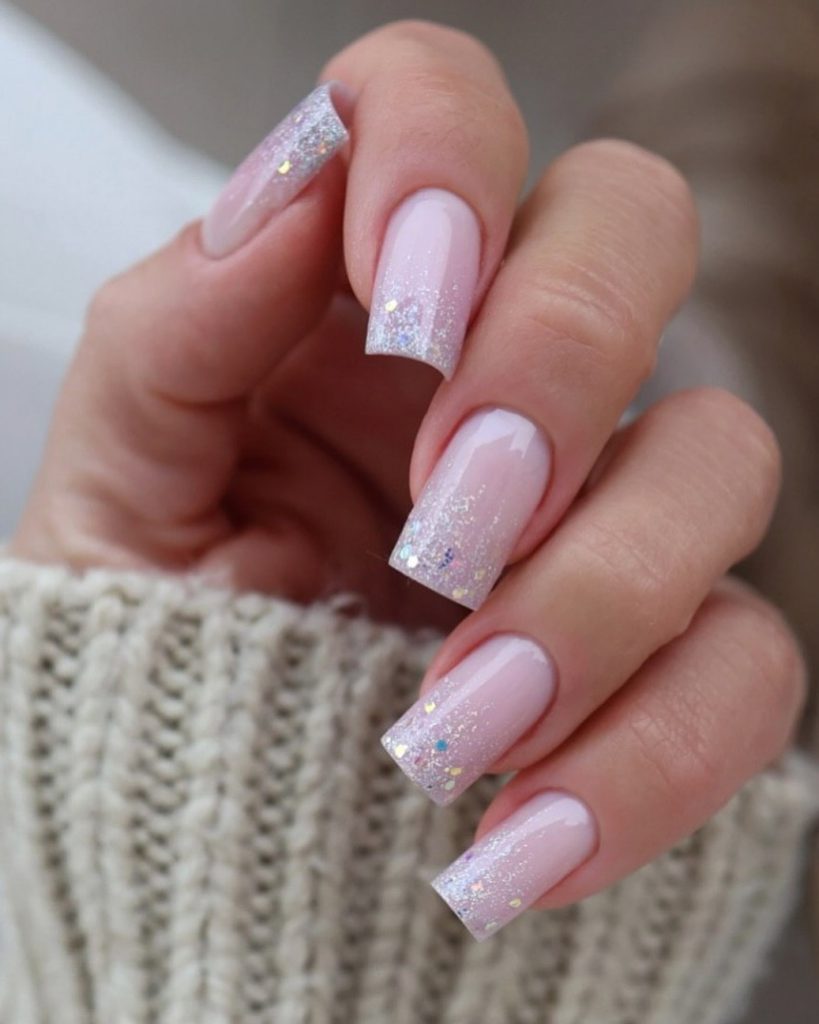 This design has a gentle sparkle that feels joyful but still refined. The soft pink base keeps things classic, while the glitter tips add a light-catching finish that feels exciting and uplifting. It’s elegant without being serious, giving your hands a fresh, youthful glow.