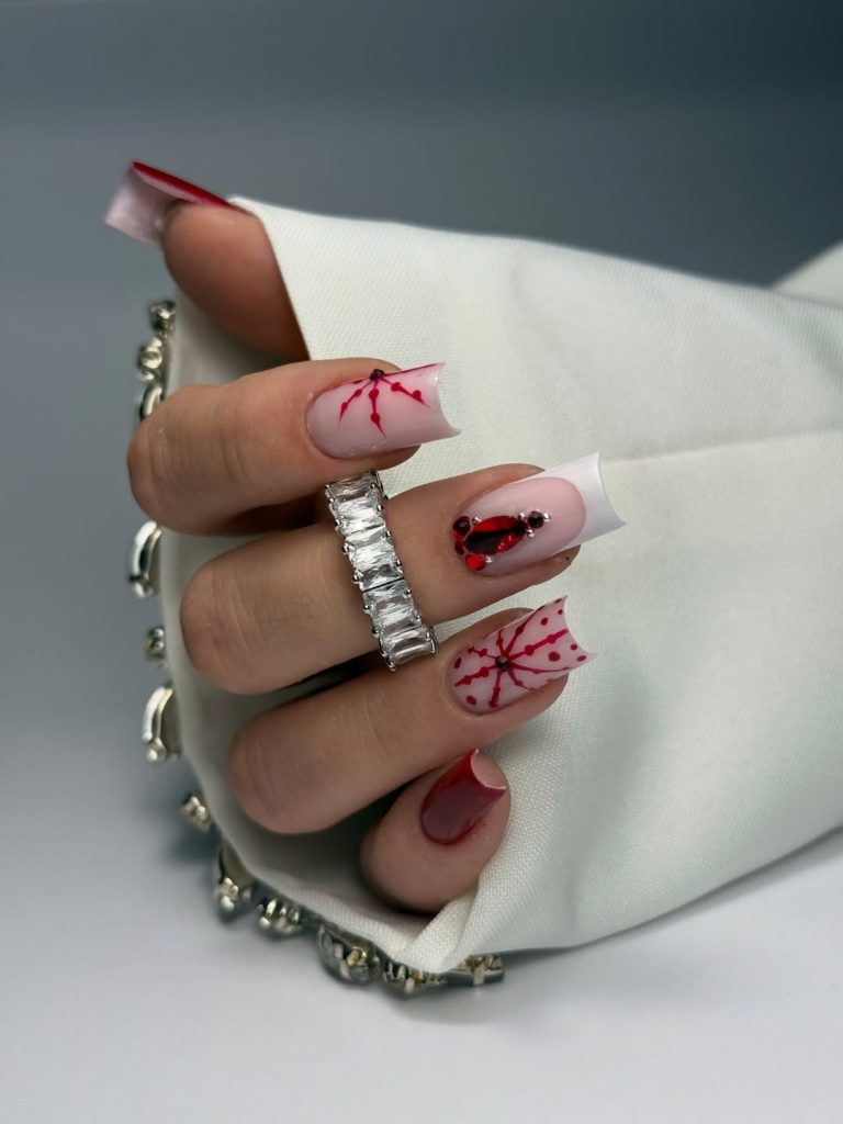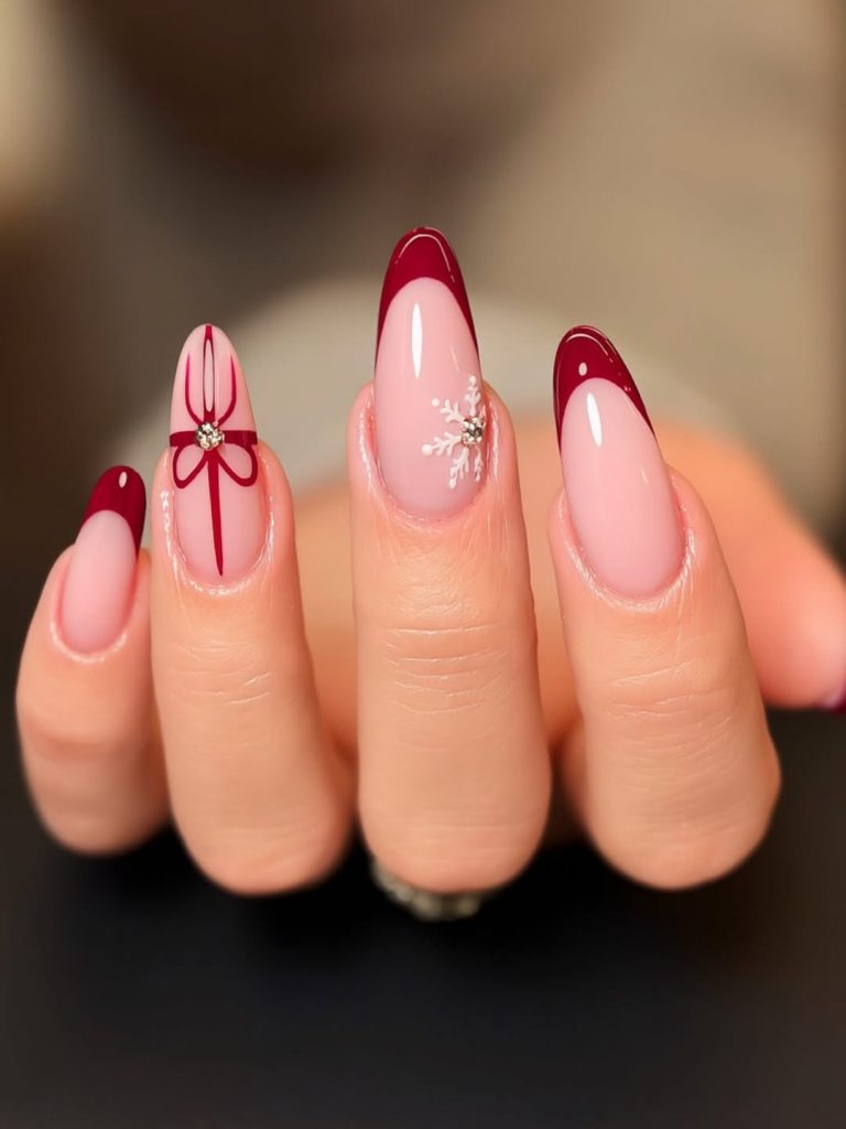 This manicure feels romantic and dramatic in the most elegant way. The soft pink base keeps it feminine and wearable, while the deep red French tips add richness and emotion. Delicate art details enhance the overall appearance, giving it a thoughtful and refined quality instead of being bold merely for the sake of it.