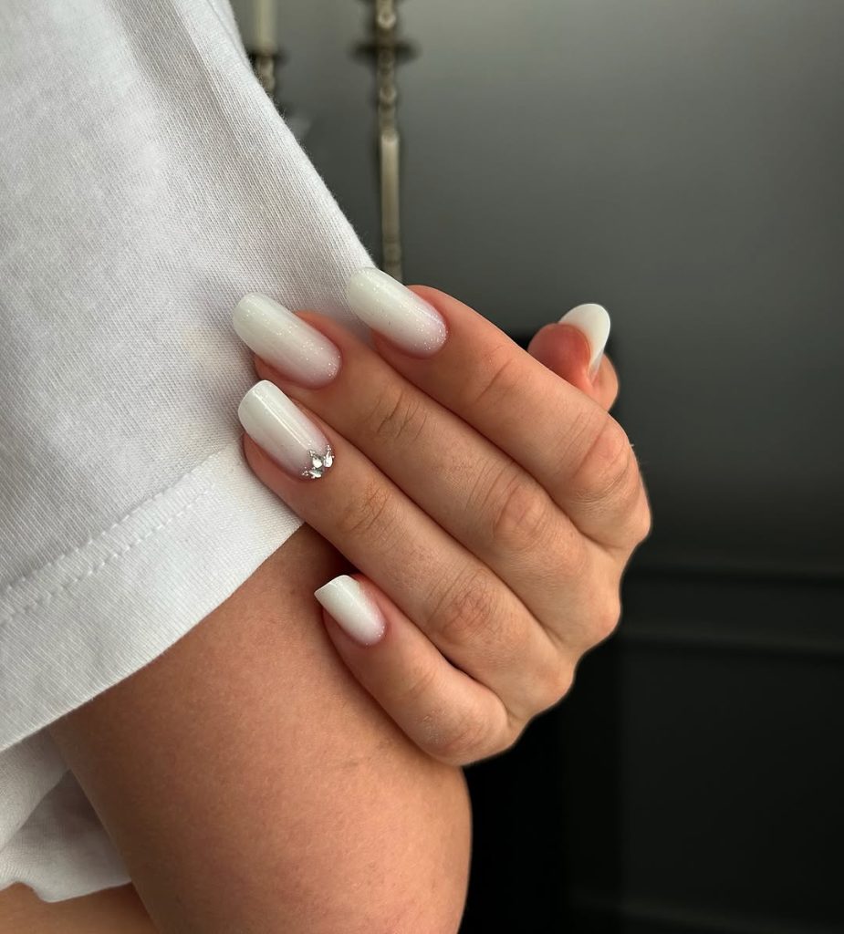 This manicure feels soft, clean, and quietly luxurious. The milky white shade has a gentle glow, enhanced by a fine shimmer that catches the light in a very subtle way. It’s elegant without being flashy, creating a look that feels fresh, calm, and beautifully put together.