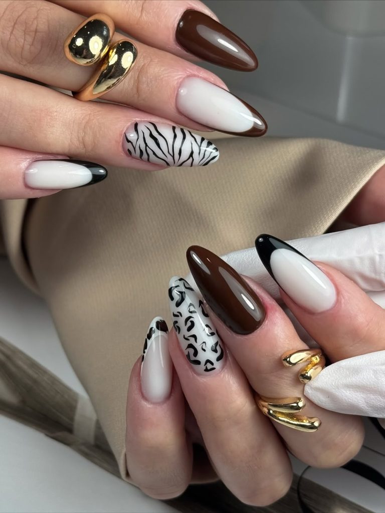There’s something bold yet refined about this mix of warm brown, clean white, and subtle animal art. The contrast feels modern and expressive but still grounded and elegant. It conveys a confident, fashion-forward vibe while staying tasteful and wearable, especially when paired with gold jewelry and neutral outfits.