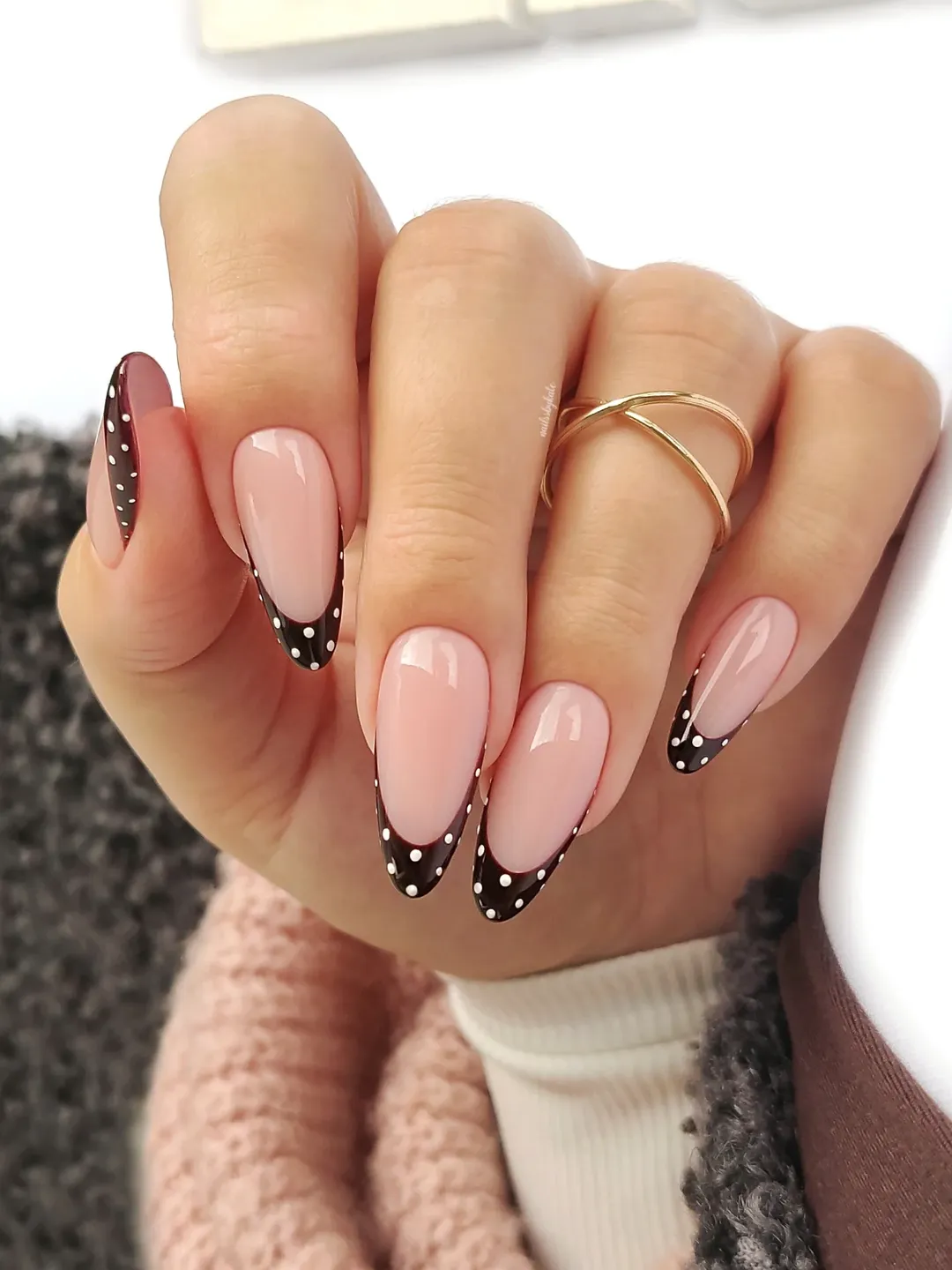 These nails strike a beautiful balance between playful and polished. The nude pink base feels soft and feminine, while the black tips with delicate dots add charm and personality. It’s lighthearted but still elegant, perfect for women who enjoy subtle details that make a look memorable.