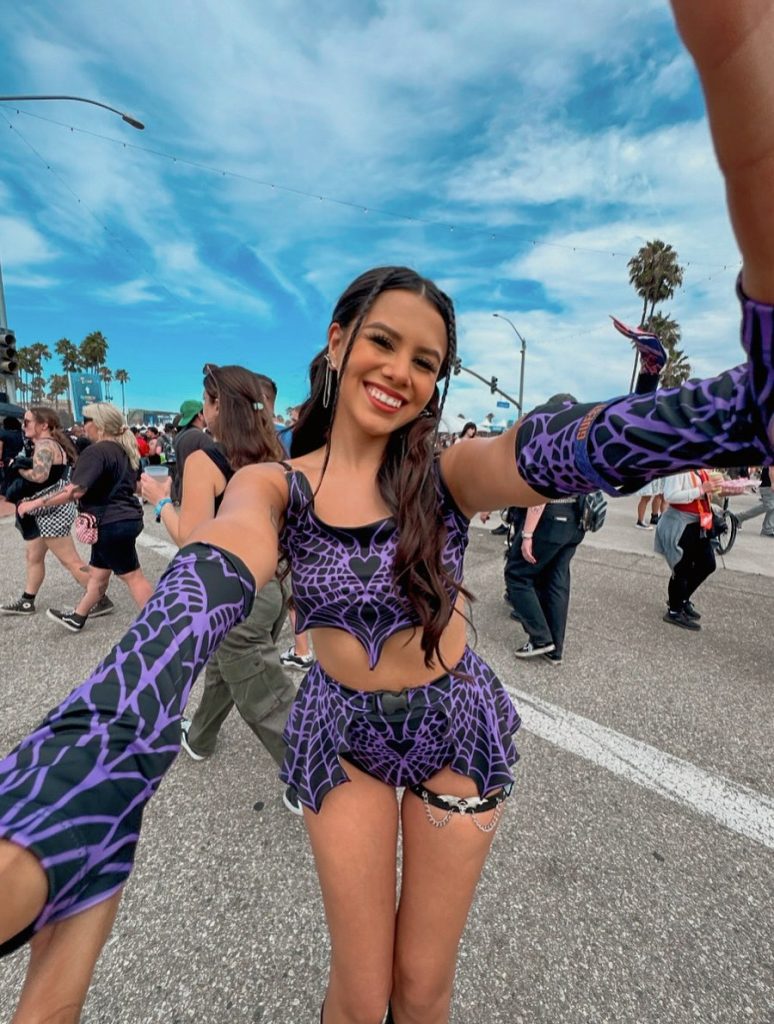 There’s something instantly electric about this purple web-pattern set—like the moment you step onto the festival grounds, the whole day opens up with that mix of freedom, fun, and a little bit of mischief. The playful cut, the confidence in the pose, and the way the colors pop under the bright sky give the outfit a boldness that fits right into the energy of music, rave crowds, and those unforgettable 2026 moments. It has that cool, carefree vibe that makes you feel like you’re exactly where you’re supposed to be, soaking up the sound, the sun, and the inspiration of the day.