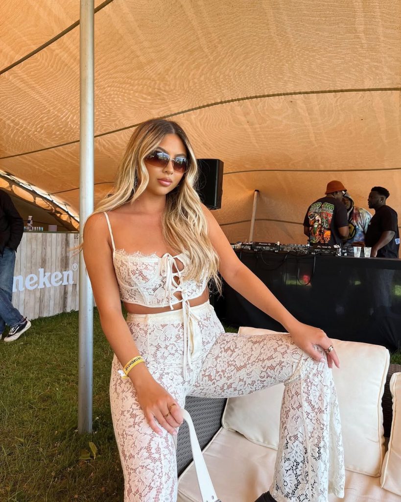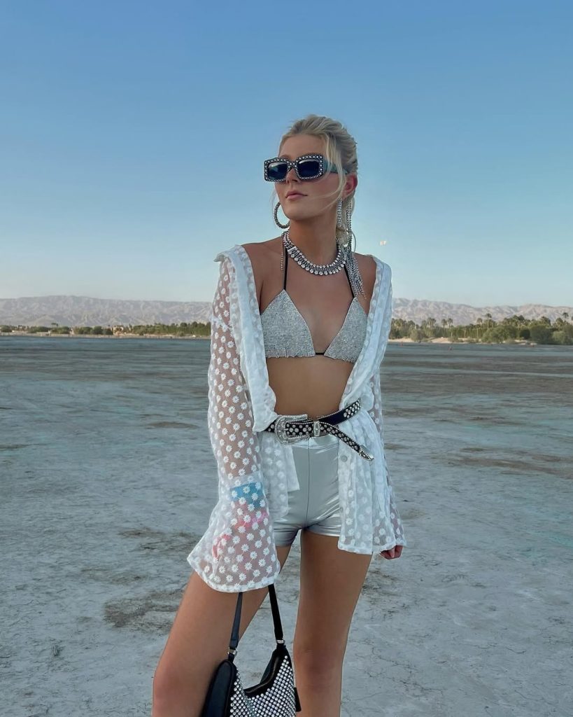 There’s something effortlessly cool about an all-lace set, especially when it catches that soft festival lighting. This look feels like the perfect mix of boho, beach, and casual glam—the kind of outfit you reach for when you want to look put-together without trying too hard. It has that relaxed confidence we all crave at a music weekend, whether you’re drifting between EDM stages or easing into a country music sunset set.