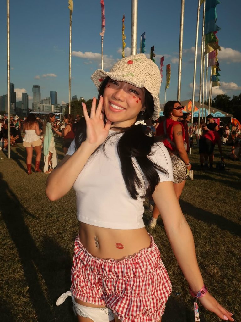 There’s such a joyful, almost nostalgic charm to this gingham moment—like stepping into a carefree summer afternoon. The crochet hat, the soft waves of movement, the playful details on her shorts… everything about this look radiates pure festival inspo. It captures that mix of cool and cute you see at laneway events in Australia or UK gatherings where the crowd blends quirky fashion with easy comfort.