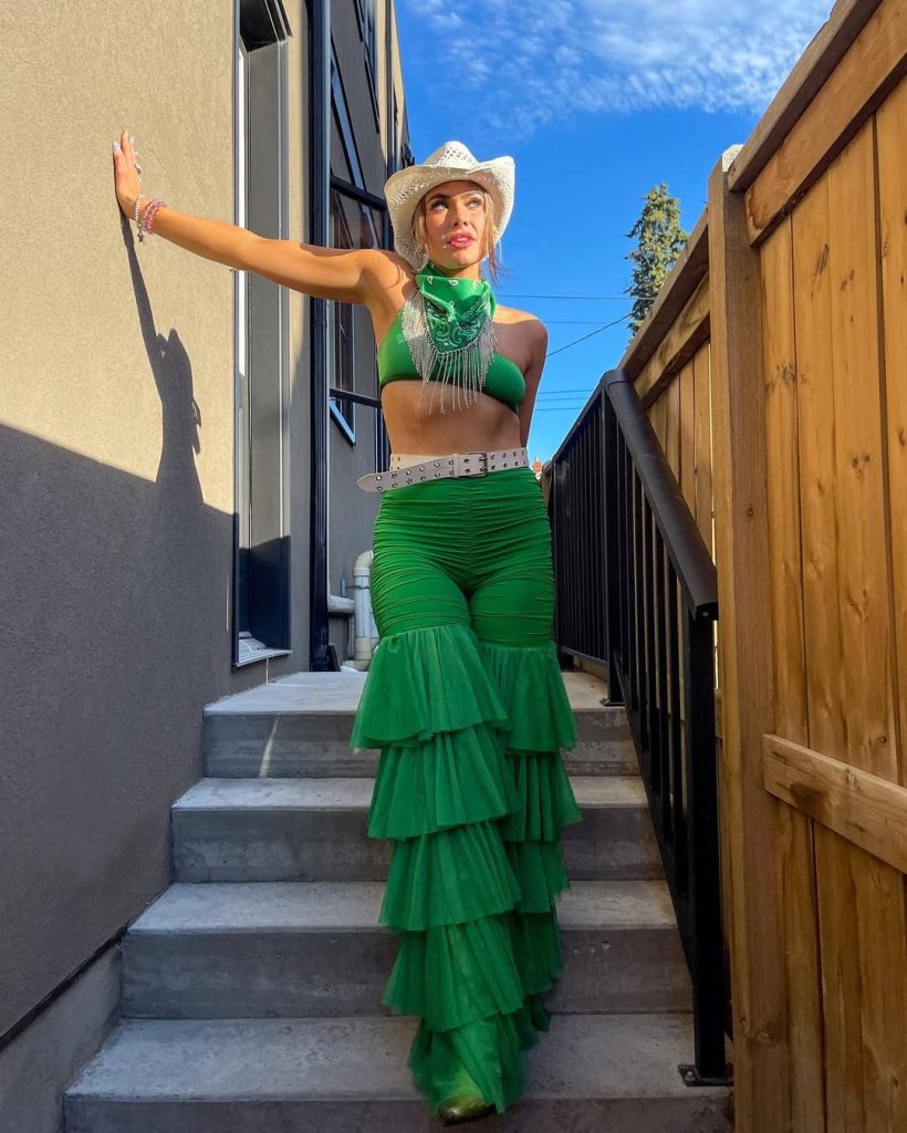 What makes this outfit special is how it thrives on movement. The layered ruffles sway with every step, making the whole look come alive as you dance. It’s ideal for women who love expressive fashion and aren’t afraid of saturated color trends in 2026. Style it with metallic boots or platform sneakers to keep the vibe elevated but wearable.