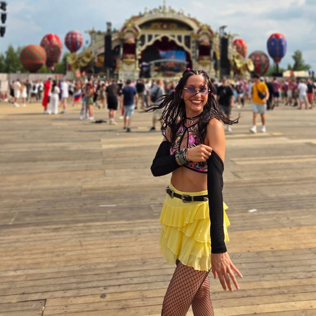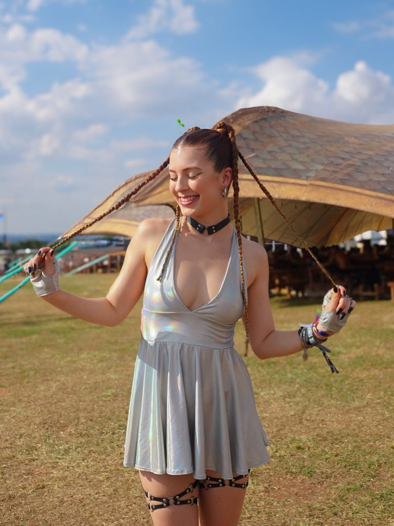 This silver holographic mini dress instantly channels that futuristic festival fantasy—glowing, shimmering, and full of energy. The shine catches every bit of sunlight, turning the outfit into something almost magical, especially paired with the long braided hairstyle. It feels like stepping into the heart of a 2026 electro lineup, where the music pulses through the air and everyone is dressed to celebrate the moment. The look is bold but soft, powerful but feminine, and completely in tune with modern festival trends.